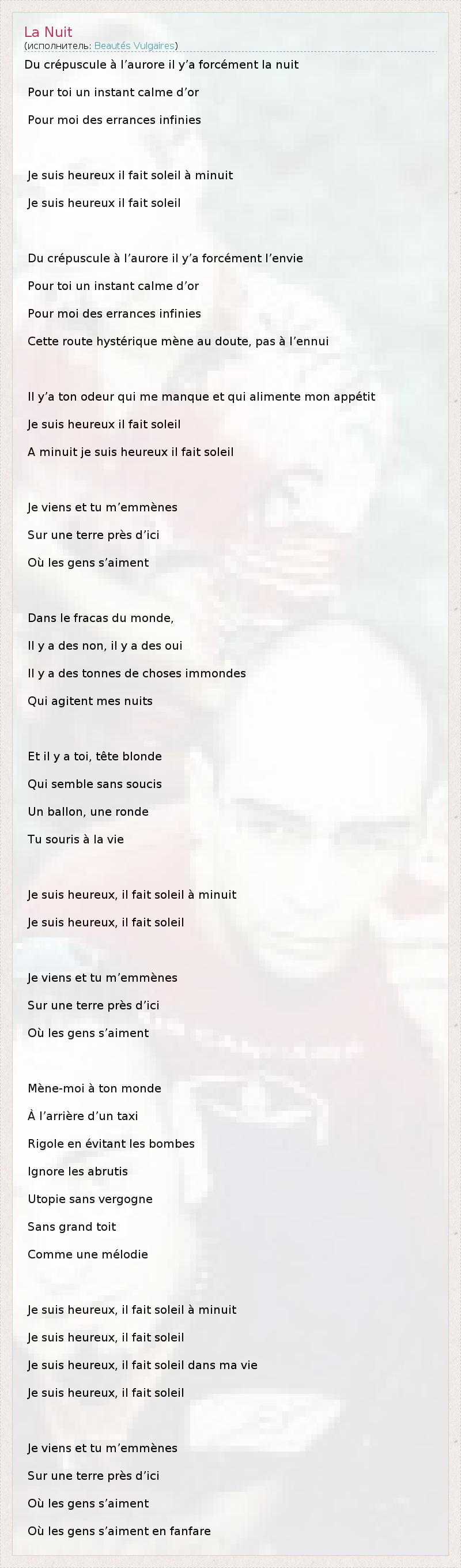 Du crépuscule à l’aurore il y’a forcément la nuit Pour toi un instant calme d’or Pour moi des errances infinies Je suis heureux il fait soleil à minuit Je suis heureux il fait soleil Du crépuscule à l’aurore il y’a forcément l’envie Pour toi un instant calme d’or Pour moi des errances infinies Cette route hystérique mène au doute, pas à l’ennui Il y’a ton odeur qui me manque et qui alimente mon appétit Je suis heureux il fait soleil A minuit je suis heureux il fait soleil Je viens et tu m’emmènes Sur une terre près d’ici Où les gens s’aiment Dans le fracas du monde, Il y a des non, il y a des oui Il y a des tonnes de choses immondes Qui agitent mes nuits Et il y a toi, tête blonde Qui semble sans soucis Un ballon, une ronde Tu souris à la vie Je suis heureux, il fait soleil à minuit Je suis heureux, il fait soleil Je viens et tu m’emmènes Sur une terre près d’ici Où les gens s’aiment Mène-moi à ton monde À l’arrière d’un taxi Rigole en évitant les bombes Ignore les abrutis Utopie sans vergogne Sans grand toit Comme une mélodie Je suis heureux, il fait soleil à minuit Je suis heureux, il fait soleil Je suis heureux, il fait soleil dans ma vie Je suis heureux, il fait soleil Je viens et tu m’emmènes Sur une terre près d’ici Où les gens s’aiment Où les gens s’aiment en fanfare