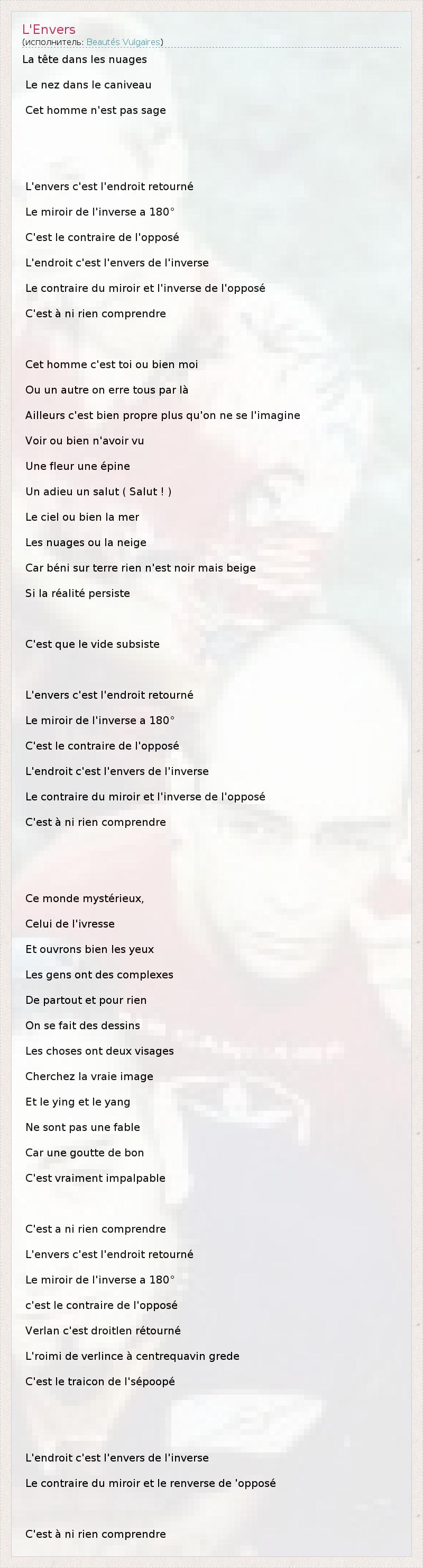 La tête dans les nuages Le nez dans le caniveau Cet homme n'est pas sage L'envers c'est l'endroit retourné Le miroir de l'inverse a 180° C'est le contraire de l'opposé L'endroit c'est l'envers de l'inverse Le contraire du miroir et l'inverse de l'opposé C'est à ni rien comprendre Cet homme c'est toi ou bien moi Ou un autre on erre tous par là Ailleurs c'est bien propre plus qu'on ne se l'imagine Voir ou bien n'avoir vu Une fleur une épine Un adieu un salut ( Salut ! ) Le ciel ou bien la mer Les nuages ou la neige Car béni sur terre rien n'est noir mais beige Si la réalité persiste C'est que le vide subsiste L'envers c'est l'endroit retourné Le miroir de l'inverse a 180° C'est le contraire de l'opposé L'endroit c'est l'envers de l'inverse Le contraire du miroir et l'inverse de l'opposé C'est à ni rien comprendre Ce monde mystérieux, Celui de l'ivresse Et ouvrons bien les yeux Les gens ont des complexes De partout et pour rien On se fait des dessins Les choses ont deux visages Cherchez la vraie image Et le ying et le yang Ne sont pas une fable Car une goutte de bon C'est vraiment impalpable C'est a ni rien comprendre L'envers c'est l'endroit retourné Le miroir de l'inverse a 180° c'est le contraire de l'opposé Verlan c'est droitlen rétourné L'roimi de verlince à centrequavin grede C'est le traicon de l'sépoopé L'endroit c'est l'envers de l'inverse Le contraire du miroir et le renverse de 'opposé C'est à ni rien comprendre