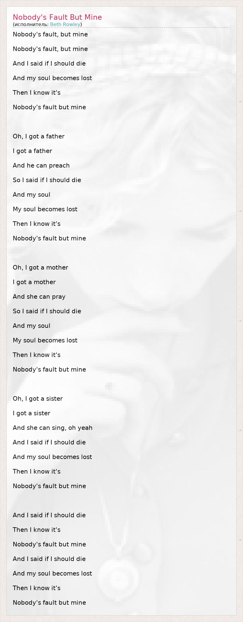 Nobody's fault, but mine Nobody's fault, but mine And I said if I should die And my soul becomes lost Then I know it's Nobody's fault but mine Oh, I got a father I got a father And he can preach So I said if I should die And my soul My soul becomes lost Then I know it's Nobody's fault but mine Oh, I got a mother I got a mother And she can pray So I said if I should die And my soul My soul becomes lost Then I know it's Nobody's fault but mine Oh, I got a sister I got a sister And she can sing, oh yeah And I said if I should die And my soul becomes lost Then I know it's Nobody's fault but mine And I said if I should die Then I know it's Nobody's fault but mine And I said if I should die And my soul becomes lost Then I know it's Nobody's fault but mine