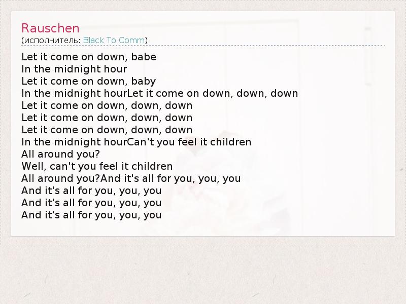 Let it come on down, babe In the midnight hour Let it come on down, baby In the midnight hourLet it come on down, down, down Let it come on down, down, down Let it come on down, down, down Let it come on down, down, down In the midnight hourCan't you feel it children All around you? Well, can't you feel it children All around you?And it's all for you, you, you And it's all for you, you, you And it's all for you, you, you And it's all for you, you, you