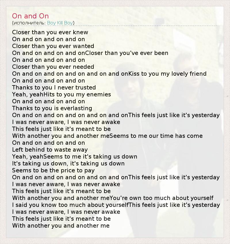 Closer than you ever knew On and on and on and on Closer than you ever wanted On and on and on and onCloser than you've ever been On and on and on and on Closer than you ever needed On and on and on and on and on and onKiss to you my lovely friend On and on and on and on Thanks to you I never trusted Yeah, yeahHits to you my enemies On and on and on and on Thanks to you is everlasting On and on and on and on and on and onThis feels just like it's yesterday I was never aware, I was never awake This feels just like it's meant to be With another you and another meSeems to me our time has come On and on and on and on Left behind to waste away Yeah, yeahSeems to me it's taking us down It's taking us down, it's taking us down Seems to be the price to pay On and on and on and on and on and onThis feels just like it's yesterday I was never aware, I was never awake This feels just like it's meant to be With another you and another meYou're own too much about yourself I said you know too much about yourselfThis feels just like it's yesterday I was never aware, I was never awake This feels just like it's meant to be With another you and another me