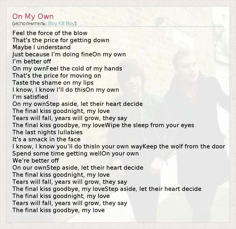 Feel the force of the blow That's the price for getting down Maybe I understand Just because I'm doing fineOn my own I'm better off On my ownFeel the cold of my hands That's the price for moving on Taste the shame on my lips I know, I know I'll do thisOn my own I'm satisfied On my ownStep aside, let their heart decide The final kiss goodnight, my love Tears will fall, years will grow, they say The final kiss goodbye, my loveWipe the sleep from your eyes The last nights lullabies It's a smack in the face I know, I know you'll do thisIn your own wayKeep the wolf from the door Spend some time getting wellOn your own We're better off On our ownStep aside, let their heart decide The final kiss goodnight, my love Tears will fall, years will grow, they say The final kiss goodbye, my loveStep aside, let their heart decide The final kiss goodnight, my love Tears will fall, years will grow, they say The final kiss goodbye, my love