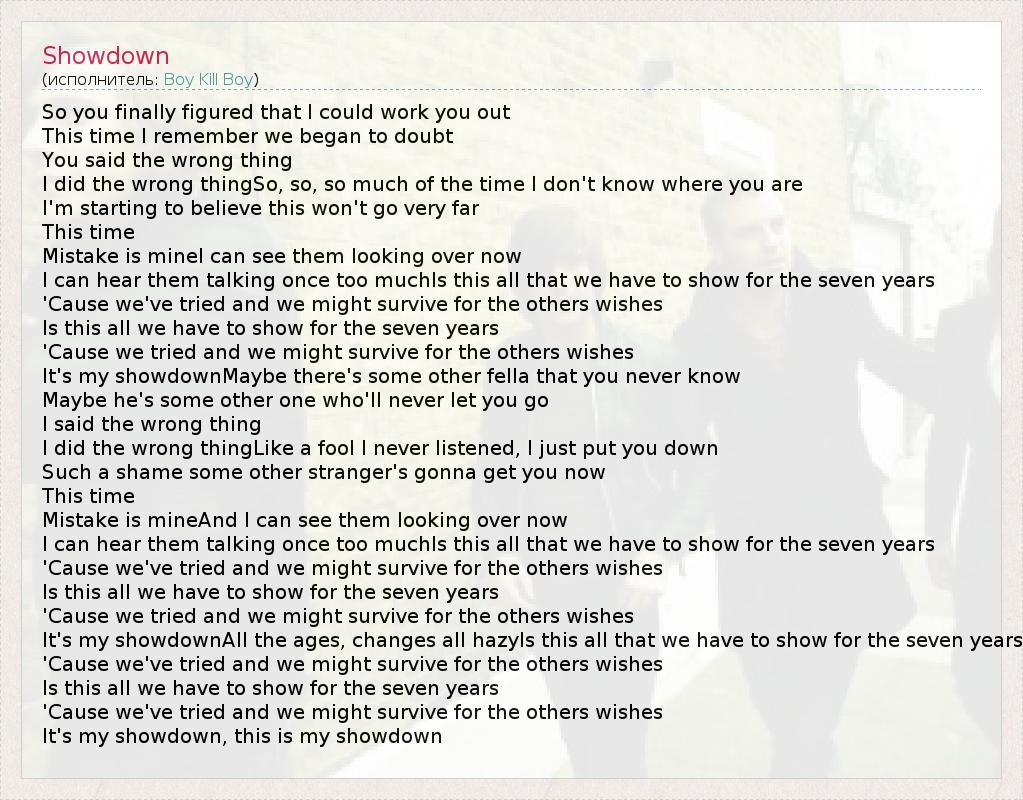 So you finally figured that I could work you out This time I remember we began to doubt You said the wrong thing I did the wrong thingSo, so, so much of the time I don't know where you are I'm starting to believe this won't go very far This time Mistake is mineI can see them looking over now I can hear them talking once too muchIs this all that we have to show for the seven years 'Cause we've tried and we might survive for the others wishes Is this all we have to show for the seven years 'Cause we tried and we might survive for the others wishes It's my showdownMaybe there's some other fella that you never know Maybe he's some other one who'll never let you go I said the wrong thing I did the wrong thingLike a fool I never listened, I just put you down Such a shame some other stranger's gonna get you now This time Mistake is mineAnd I can see them looking over now I can hear them talking once too muchIs this all that we have to show for the seven years 'Cause we've tried and we might survive for the others wishes Is this all we have to show for the seven years 'Cause we tried and we might survive for the others wishes It's my showdownAll the ages, changes all hazyIs this all that we have to show for the seven years 'Cause we've tried and we might survive for the others wishes Is this all we have to show for the seven years 'Cause we've tried and we might survive for the others wishes It's my showdown, this is my showdown