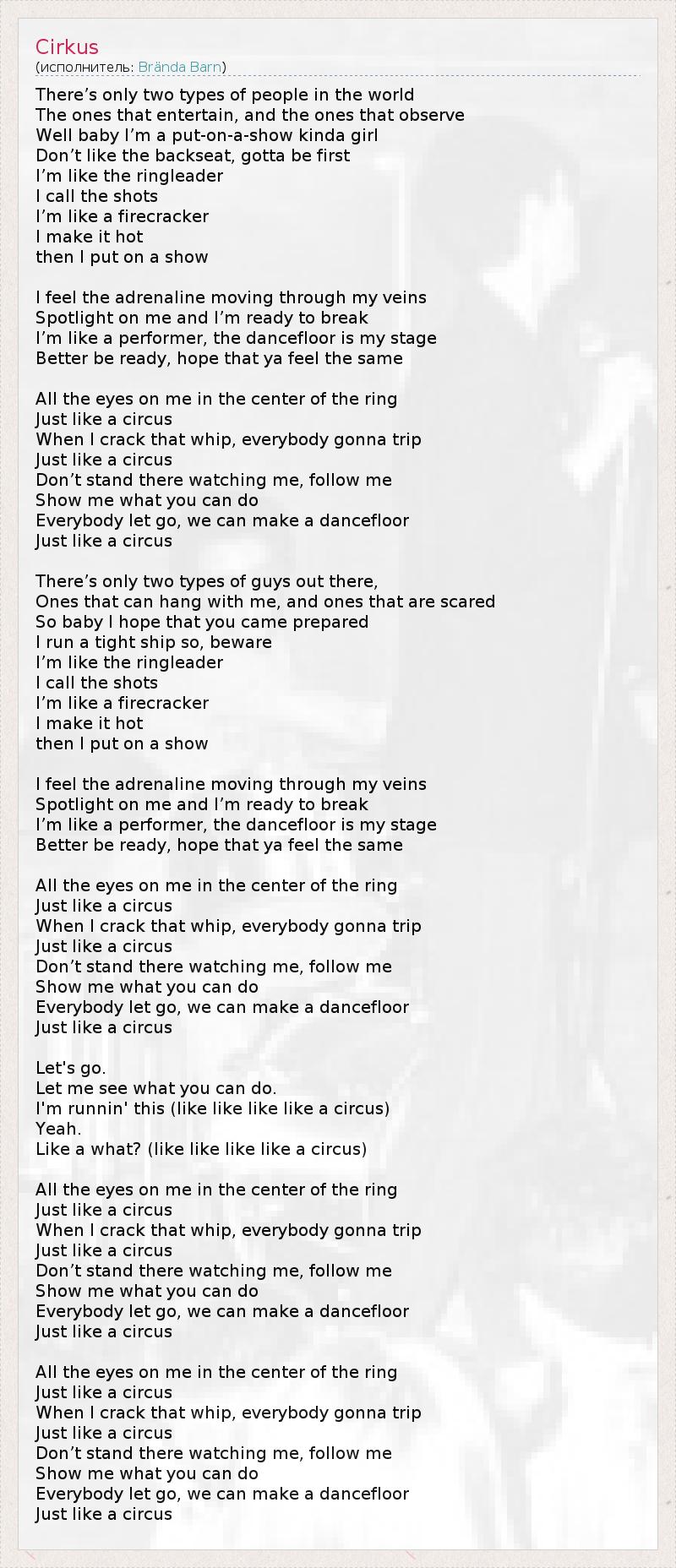 В мире есть люди двух типов: Одни развлекают, другие смотрят на их шоу. Так что, детка, я отношусь к первому типу людей. Я не люблю второстепенные роли, я люблю быть первой. Я, как заводила, Вызываю овации. Я, как акробат с огнем: Вам станет жарко, Когда я начну шоу. Я чувствую, как адреналин проходит по моим венам. Свет направлен на меня, и я готова зажечь. Я, как актриса, танцпол - моя сцена. Лучше приготовься, надеюсь, ты почувствуешь то же. Все взгляды направлены на меня в центр арены, Как будто мы в цирке. Когда я ударяю кнутом, все готовы повиноваться мне, Как будто мы в цирке. Не надо стоять и смотреть на меня, просто следуй за мной. Покажи мне, что ты можешь. Все начинают двигаться. Мы зажжем на танцполе, Как будто мы в цирке. Здесь есть два типа парней: Одни могут оторваться со мной, другие же боятся. Эй, малыш, я надеюсь ты подготовился заранее? Я быстро разогреваюсь. Берегись. Я, как заводила, Вызываю овации. Я, как акробат с огнем: Вам станет жарко, Когда я начну шоу. Я чувствую, как адреналин проходит по моим венам. Свет направлен на меня и я готова зажечь. Я как актриса, танцпол - моя сцена. Лучше приготовься, надеюсь, ты почувствуешь то же. Все взгляды направлены на меня в центр арены, Как будто мы в цирке. Когда я ударяю кнутом, все готовы повиноваться мне, Как будто мы в цирке. Не надо стоять и смотреть на меня, просто следуй за мной. Покажи мне, что ты можешь. Все начинают двигаться. Мы зажжем на танцполе, Как будто мы в цирке. Начали! Покажи мне что ты можешь! Я делаю это (как как как как в цирке) Да. Ты хочешь так? (как как как как в цирке) Все взгляды направлены на меня в центр арены, Как будто мы в цирке. Когда я ударяю кнутом, все готовы повиноваться мне, Как будто мы в цирке. Не надо стоять и смотреть на меня, просто следуй за мной. Покажи мне, что ты можешь. Все начинают двигаться. Мы зажжем на танцполе, Как будто мы в цирке. Все взгляды направлены на меня в центр арены, Как будто мы в цирке. Когда я ударяю кнутом, все готовы повиноваться мне, Как будто мы в цирке. Не надо стоять и смотреть на меня, просто следуй за мной. Покажи мне, что ты можешь. Все начинают двигаться. Мы зажжем на танцполе, Как будто мы в цирке.