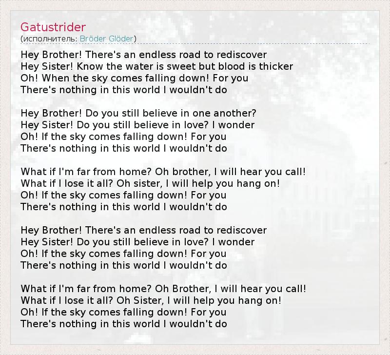 Hey Brother! There's an endless road to rediscover Hey Sister! Know the water is sweet but blood is thicker Oh! When the sky comes falling down! For you There's nothing in this world I wouldn't do Hey Brother! Do you still believe in one another? Hey Sister! Do you still believe in love? I wonder Oh! If the sky comes falling down! For you There's nothing in this world I wouldn't do What if I'm far from home? Oh brother, I will hear you call! What if I lose it all? Oh sister, I will help you hang on! Oh! If the sky comes falling down! For you There's nothing in this world I wouldn't do Hey Brother! There's an endless road to rediscover Hey Sister! Do you still believe in love? I wonder Oh! If the sky comes falling down! For you There's nothing in this world I wouldn't do What if I'm far from home? Oh Brother, I will hear you call! What if I lose it all? Oh Sister, I will help you hang on! Oh! If the sky comes falling down! For you There's nothing in this world I wouldn't do