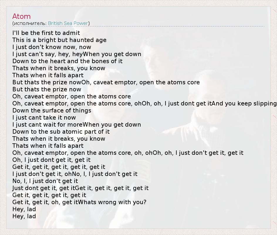 I'll be the first to admit This is a bright but haunted age I just don't know now, now I just can't say, hey, heyWhen you get down Down to the heart and the bones of it Thats when it breaks, you know Thats when it falls apart But thats the prize nowOh, caveat emptor, open the atoms core But thats the prize now Oh, caveat emptor, open the atoms core Oh, caveat emptor, open the atoms core, ohOh, oh, I just dont get itAnd you keep slipping Down the surface of things I just cant take it now I just cant wait for moreWhen you get down Down to the sub atomic part of it Thats when it breaks, you know Thats when it falls apart Oh, caveat emptor, open the atoms core, oh, ohOh, oh, I just don't get it, get it Oh, I just dont get it, get it Get it, get it, get it, get it, get it I just don't get it, ohNo, I, I just don't get it No, I, I just don't get it Just dont get it, get itGet it, get it, get it, get it Get it, get it, get it, get it Get it, get it, oh, get itWhats wrong with you? Hey, lad Hey, lad
