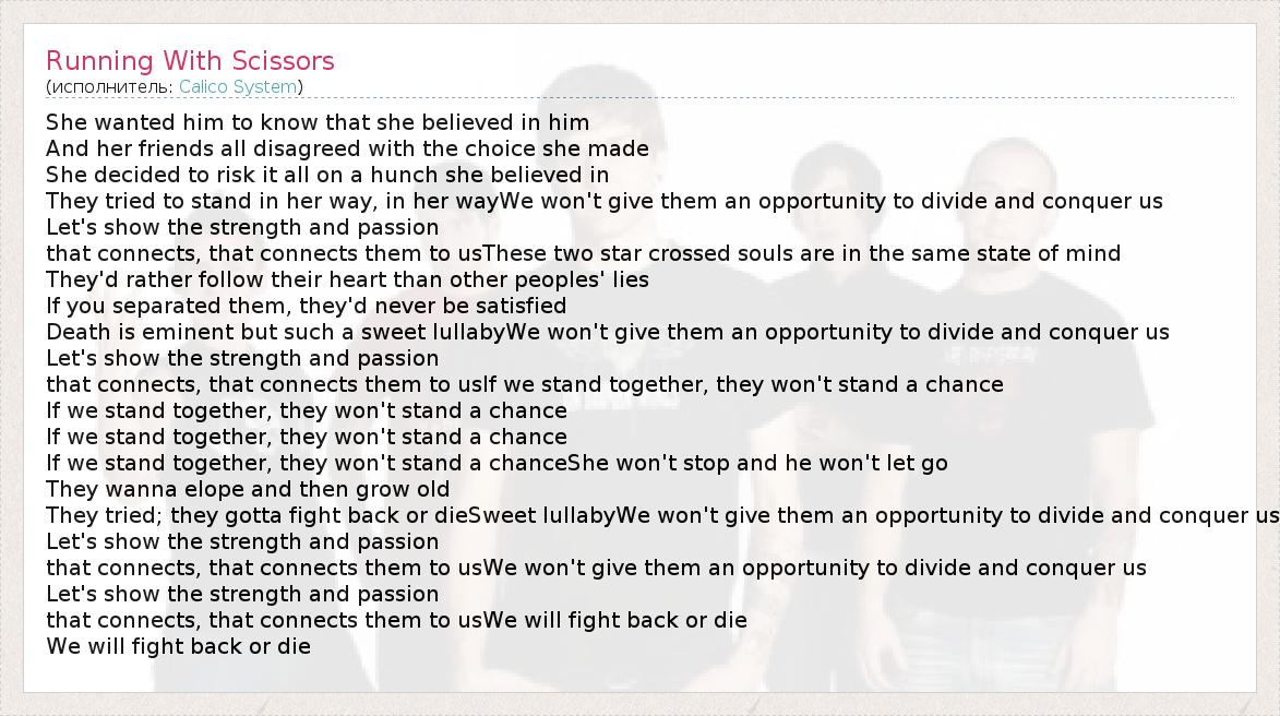 А как ты думаешь, о чем песня "Running With Scissors" ?