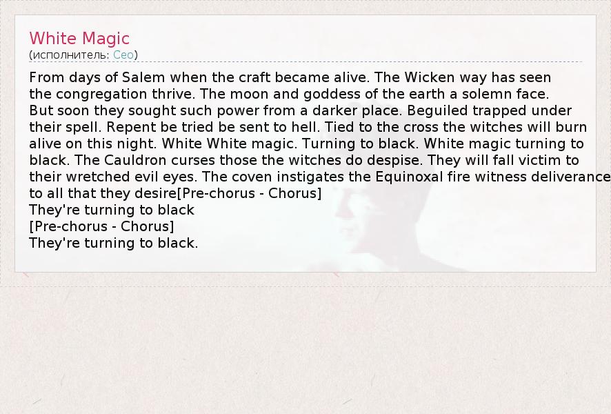 From days of Salem when the craft became alive. The Wicken way has seen the congregation thrive. The moon and goddess of the earth a solemn face. But soon they sought such power from a darker place. Beguiled trapped under their spell. Repent be tried be sent to hell. Tied to the cross the witches will burn alive on this night. White White magic. Turning to black. White magic turning to black. The Cauldron curses those the witches do despise. They will fall victim to their wretched evil eyes. The coven instigates the Equinoxal fire witness deliverance to all that they desire[Pre-chorus - Chorus] They're turning to black [Pre-chorus - Chorus] They're turning to black.