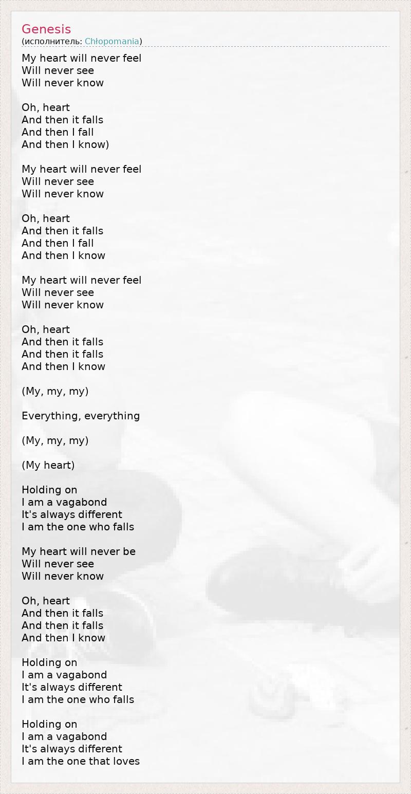 Мое сердце никогда не ощутит, Никогда не увидит, Никогда не узнает. О, сердце, - Оно обрывается, И я падаю, И я понимаю... Мое сердце никогда не ощутит, Никогда не увидит, Никогда не узнает. О, сердце, - Оно обрывается, И я падаю, И я понимаю... Мое сердце никогда не ощутит, Никогда не увидит, Никогда не узнает. О, сердце, - Оно обрывается, И я падаю, И я понимаю... (Мое, мое, мое...) Все на свете, все на свете (Мое, мое, мое...) (...Мое сердце) Держись, не отпускай... И я - бродяга. Я всегда разная; Я - та, кто падает... Мое сердце никогда не ощутит, Никогда не увидит, Никогда не узнает. О, сердце, - Оно обрывается, И я падаю, И я понимаю... Держись, не отпускай... И я - бродяга. Я всегда разная; Я - та, кто падает... Держись, не отпускай... И я - бродяга. Я всегда разная; Я - та, кто любит...
