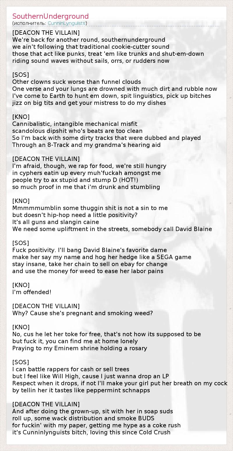 Это интересно:CunninLynguists (образована в 2000 году) - это хип-хоп команда с юга США, в которой каждый занимается как лирикой, так и продакшеном. В группу входят: Deacon The Villain, Kno и Natti. Они успели поработать с OutKast, UGK, Goodie Mob, Witchdoctor, Geto Boys и другими хип-хоп артистами с юга.... продолжение