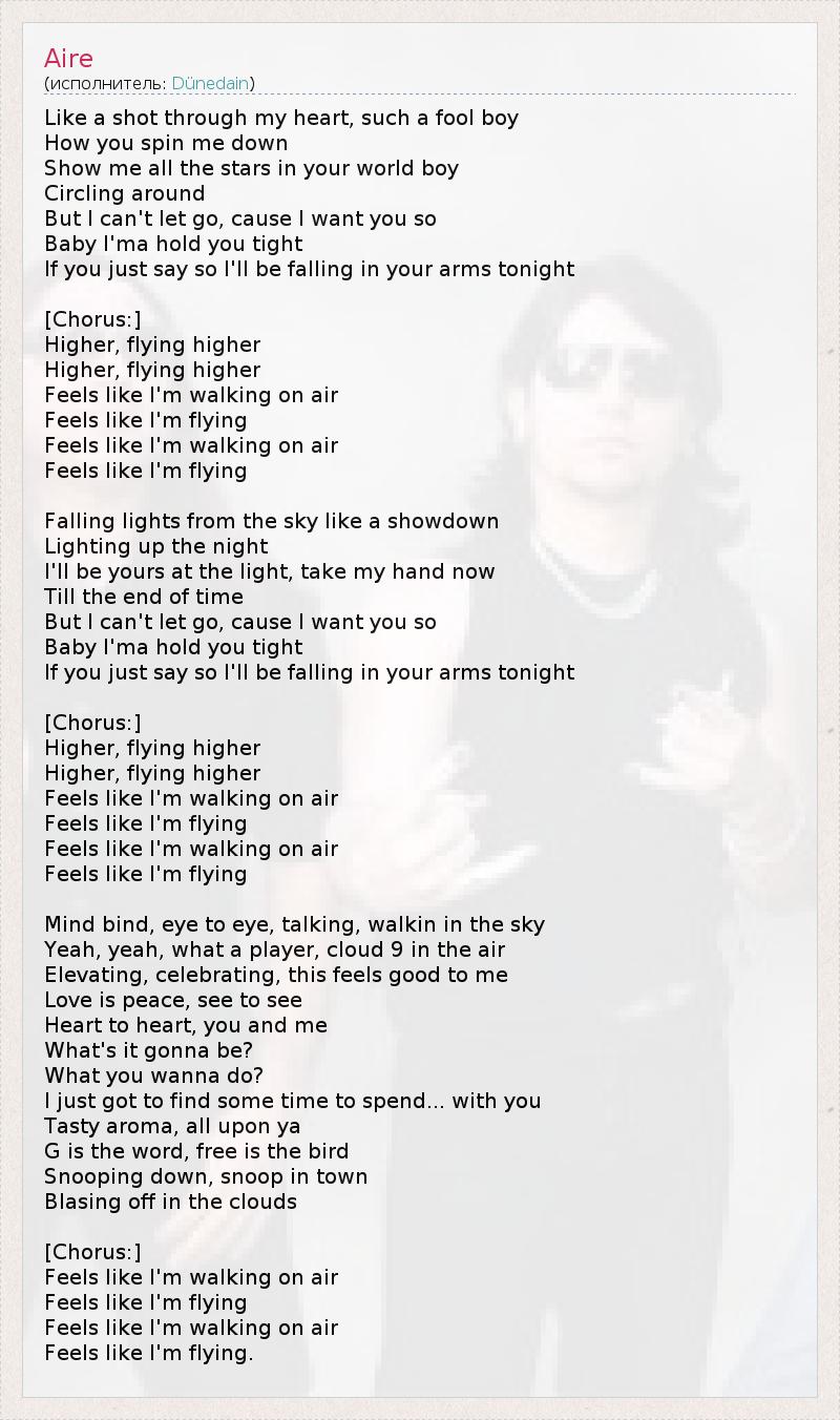 Like a shot through my heart, such a fool boy How you spin me down Show me all the stars in your world boy Circling around But I can't let go, cause I want you so Baby I'ma hold you tight If you just say so I'll be falling in your arms tonight [Chorus:] Higher, flying higher Higher, flying higher Feels like I'm walking on air Feels like I'm flying Feels like I'm walking on air Feels like I'm flying Falling lights from the sky like a showdown Lighting up the night I'll be yours at the light, take my hand now Till the end of time But I can't let go, cause I want you so Baby I'ma hold you tight If you just say so I'll be falling in your arms tonight [Chorus:] Higher, flying higher Higher, flying higher Feels like I'm walking on air Feels like I'm flying Feels like I'm walking on air Feels like I'm flying Mind bind, eye to eye, talking, walkin in the sky Yeah, yeah, what a player, cloud 9 in the air Elevating, celebrating, this feels good to me Love is peace, see to see Heart to heart, you and me What's it gonna be? What you wanna do? I just got to find some time to spend... with you Tasty aroma, all upon ya G is the word, free is the bird Snooping down, snoop in town Blasing off in the clouds [Chorus:] Feels like I'm walking on air Feels like I'm flying Feels like I'm walking on air Feels like I'm flying.