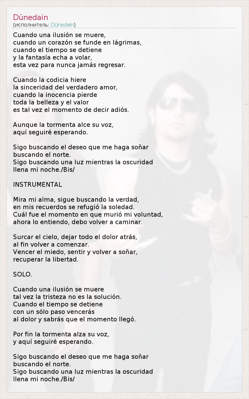 Cuando уна Ilusion себе muere, Cuando ООН corazón себе funde ан Lágrimas, Cuando Тьемпо себе detiene у ла Fantasía ИКГВ ладонной, Эста Чавес пункт Nunca JAMAS regresar. Cuando ла codicia hiere ла sinceridad дель verdadero Амор, Cuando ла inocencia pierde тода La Belleza у эль доблесть ES Таль Чавес-эль Momento де decir Adiós. Aunque ла Tormenta Alce су Вос, aquí seguiré Esperando. Sigo Buscando эль Deseo Que мне Хага Sonar Buscando эль-Норте. Sigo Buscando уна Лус mientras ла oscuridad Llena миль ночь. / бис / ИНСТРУМЕНТАЛЬНЫЙ Мира миль альма, Sigue Buscando ла Verdad, ан неправильно Recuerdos себе Refúgio-ла-Соледад. Cuál ФРУ эль Momento ан Que Murio миль voluntad, Ahora вот entiendo, Debo Volver caminar. SURCAR эль Cielo, dejar TODO-эль боль Atras, аль плавник Volver comenzar. Vencer эль Miedo, Sentir у Volver сонар, recuperar Ла-Либертад. СОЛО. Cuando уна Ilusion себе muere Таль Чавес ла Tristeza нет эс ла Solucion. Cuando Тьемпо себе detiene кон ООН sólo Пасо vencerás аль боль у сабр Que эль Momento llegó. Пор-ла-плавник Tormenta ALZA су Вос, у aquí seguiré Esperando. Sigo Buscando эль Deseo Que мне Хага Sonar Buscando эль-Норте. Sigo Buscando уна Лус mientras ла oscuridad Llena миль ночь. / бис /