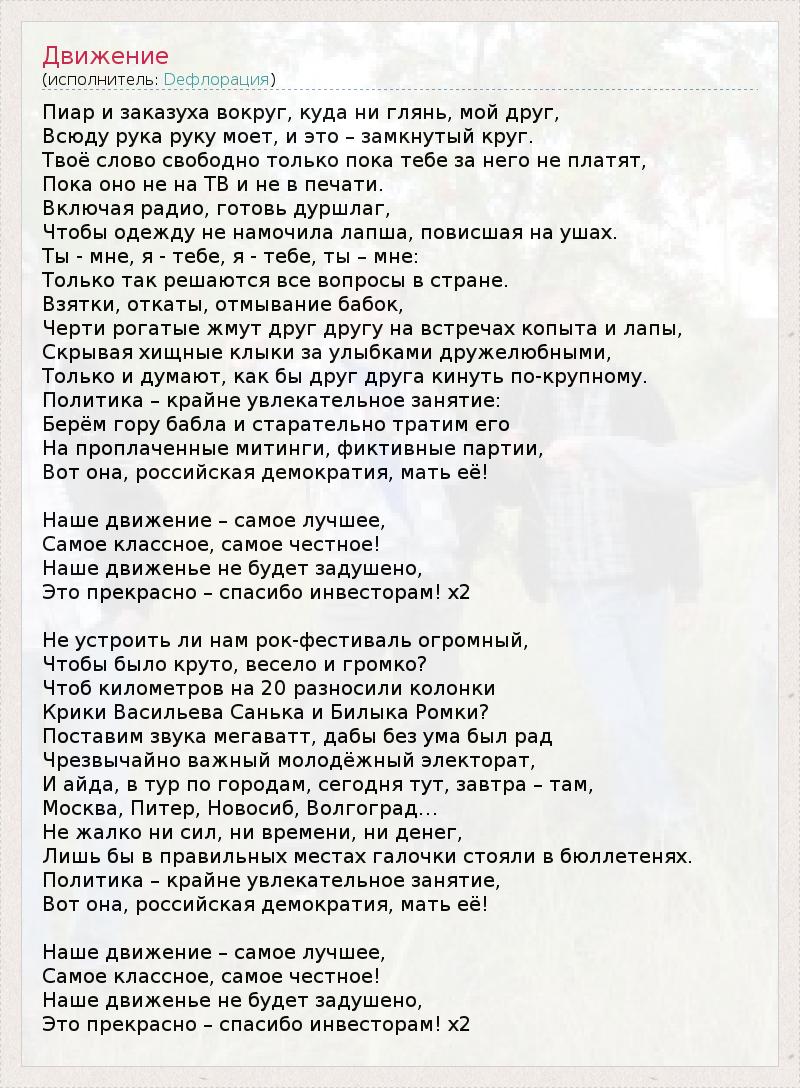 Пиар и заказуха вокруг, куда ни глянь, мой друг, Всюду рука руку моет, и это – замкнутый круг. Твоё слово свободно только пока тебе за него не платят, Пока оно не на ТВ и не в печати. Включая радио, готовь дуршлаг, Чтобы одежду не намочила лапша, повисшая на ушах. Ты - мне, я - тебе, я - тебе, ты – мне: Только так решаются все вопросы в стране. Взятки, откаты, отмывание бабок, Черти рогатые жмут друг другу на встречах копыта и лапы, Скрывая хищные клыки за улыбками дружелюбными, Только и думают, как бы друг друга кинуть по-крупному. Политика – крайне увлекательное занятие: Берём гору бабла и старательно тратим его На проплаченные митинги, фиктивные партии, Вот она, российская демократия, мать её! Наше движение – самое лучшее, Самое классное, самое честное! Наше движенье не будет задушено, Это прекрасно – спасибо инвесторам! х2 Не устроить ли нам рок-фестиваль огромный, Чтобы было круто, весело и громко? Чтоб километров на 20 разносили колонки Крики Васильева Санька и Билыка Ромки? Поставим звука мегаватт, дабы без ума был рад Чрезвычайно важный молодёжный электорат, И айда, в тур по городам, сегодня тут, завтра – там, Москва, Питер, Новосиб, Волгоград… Не жалко ни сил, ни времени, ни денег, Лишь бы в правильных местах галочки стояли в бюллетенях. Политика – крайне увлекательное занятие, Вот она, российская демократия, мать её! Наше движение – самое лучшее, Самое классное, самое честное! Наше движенье не будет задушено, Это прекрасно – спасибо инвесторам! х2