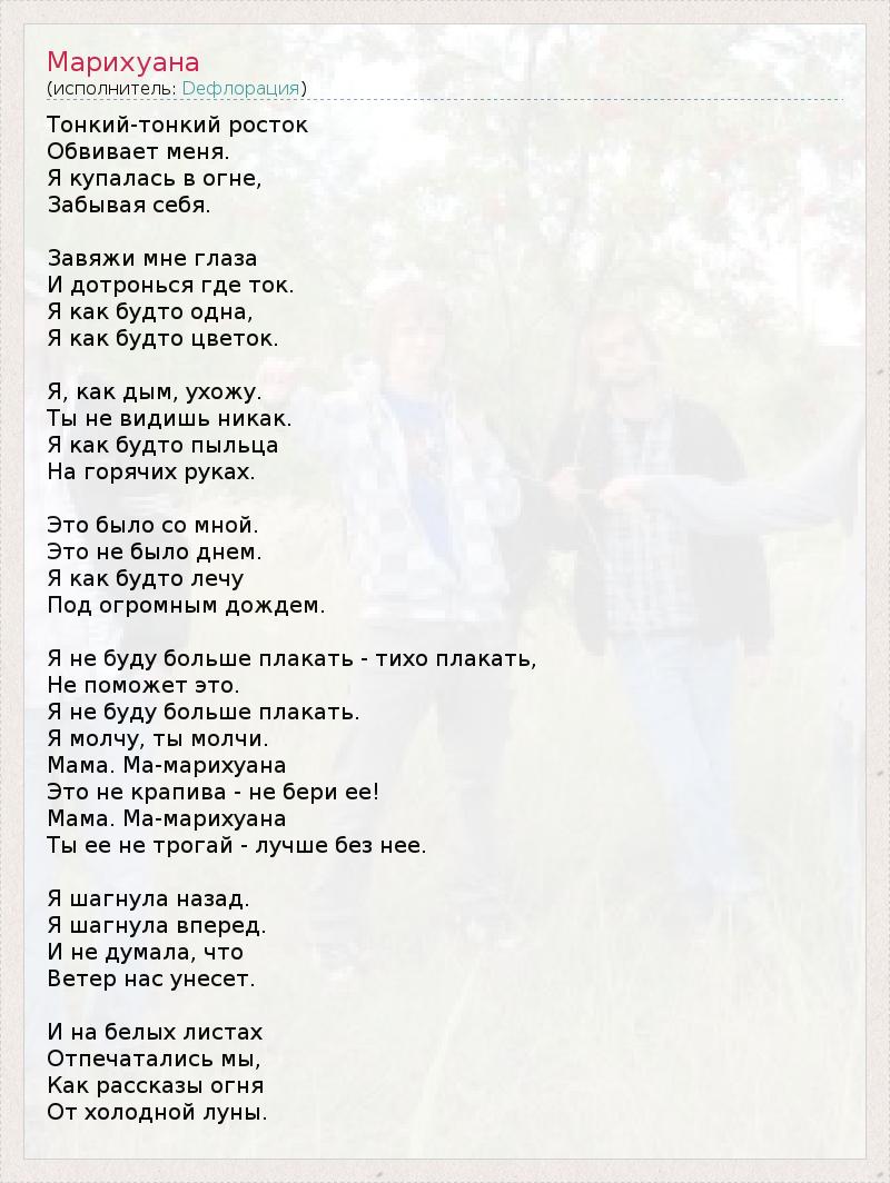 Тонкий-тонкий росток Обвивает меня. Я купалась в огне, Забывая себя. Завяжи мне глаза И дотронься где ток. Я как будто одна, Я как будто цветок. Я, как дым, ухожу. Ты не видишь никак. Я как будто пыльца На горячих руках. Это было со мной. Это не было днем. Я как будто лечу Под огромным дождем. Я не буду больше плакать - тихо плакать, Не поможет это. Я не буду больше плакать. Я молчу, ты молчи. Мама. Ма-марихуана Это не крапива - не бери ее! Мама. Ма-марихуана Ты ее не трогай - лучше без нее. Я шагнула назад. Я шагнула вперед. И не думала, что Ветер нас унесет. И на белых листах Отпечатались мы, Как рассказы огня От холодной луны.