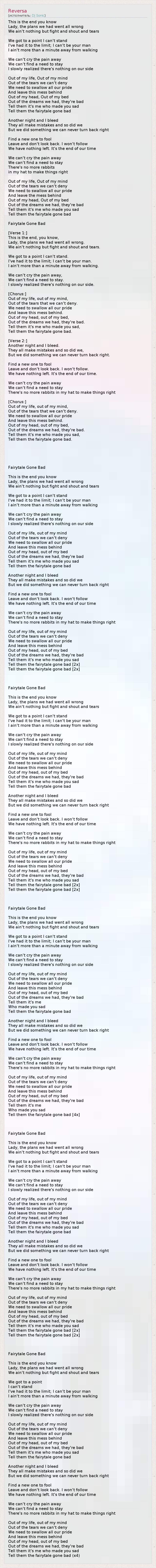 This is the end you know Lady, the plans we had went all wrong We ain't nothing but fight and shout and tears We got to a point I can't stand I've had it to the limit; I can't be your man I ain't more than a minute away from walking We can't cry the pain away We can't find a need to stay I slowly realized there's nothing on our side Out of my life, Out of my mind Out of the tears we can't deny We need to swallow all our pride And leave this mess behind Out of my head, Out of my bed Out of the dreams we had, they're bad Tell them it's me who made you sad Tell them the fairytale gone bad Another night and I bleed They all make mistakes and so did we But we did something we can never turn back right Find a new one to fool Leave and don't look back. I won't follow We have nothing left. It's the end of our time We can't cry the pain away We can't find a need to stay There's no more rabbits in my hat to make things right Out of my life, Out of my mind Out of the tears we can't deny We need to swallow all our pride And leave the mess behind Out of my head, Out of my bed Out of the dreams we had, they're bad Tell them it's me who made you sad Tell them the fairytale gone bad Fairytale Gone Bad [Verse 1:] This is the end, you know, Lady, the plans we had went all wrong. We ain't nothing but fight and shout and tears. We got to a point I can't stand. I've had it to the limit; I can't be your man. I ain't more than a minute away from walking. We can't cry the pain away, We can't find a need to stay. I slowly realized there's nothing on our side. [Chorus:] Out of my life, out of my mind, Out of the tears that we can't deny. We need to swallow all our pride And leave this mess behind. Out of my head, out of my bed, Out of the dreams we had, they're bad. Tell them it's me who made you sad, Tell them the fairytale gone bad. [Verse 2:] Another night and I bleed. They all make mistakes and so did we, But we did something we can never turn back right. Find a new one to fool Leave and don't look back. I won't follow. We have nothing left. It's the end of our time. We can't cry the pain away We can't find a need to stay There's no more rabbits in my hat to make things right [Chorus:] Out of my life, out of my mind, Out of the tears that we can't deny. We need to swallow all our pride And leave this mess behind. Out of my head, out of my bed, Out of the dreams we had, they're bad. Tell them it's me who made you sad, Tell them the fairytale gone bad. Fairytale Gone Bad This is the end you know Lady, the plans we had went all wrong We ain't nothing but fight and shout and tears We got to a point I can't stand I've had it to the limit; I can't be your man I ain't more than a minute away from walking We can't cry the pain away We can't find a need to stay I slowly realized there's nothing on our side Out of my life, out of my mind Out of the tears we can't deny We need to swallow all our pride And leave this mess behind Out of my head, out of my bed Out of the dreams we had, they're bad Tell them it's me who made you sad Tell them the fairytale gone bad Another night and I bleed They all make mistakes and so did we But we did something we can never turn back right Find a new one to fool Leave and don't look back. I won't follow We have nothing left. It's the end of our time We can't cry the pain away We can't find a need to stay There's no more rabbits in my hat to make things right Out of my life, out of my mind Out of the tears we can't deny We need to swallow all our pride And leave this mess behind Out of my head, out of my bed Out of the dreams we had, they're bad Tell them it's me who made you sad Tell them the fairytale gone bad [2x] Tell them the fairytale gone bad [2x] Fairytale Gone Bad This is the end you know Lady, the plans we had went all wrong We ain't nothing but fight and shout and tears We got to a point I can't stand I've had it to the limit; I can't be your man I ain't more than a minute away from walking We can't cry the pain away We can't find a need to stay I slowly realized there's nothing on our side Out of my life, out of my mind Out of the tears we can't deny We need to swallow all our pride And leave this mess behind Out of my head, out of my bed Out of the dreams we had, they're bad Tell them it's me who made you sad Tell them the fairytale gone bad Another night and I bleed They all make mistakes and so did we But we did something we can never turn back right Find a new one to fool Leave and don't look back. I won't follow We have nothing left. It's the end of our time We can't cry the pain away We can't find a need to stay There's no more rabbits in my hat to make things right Out of my life, out of my mind Out of the tears we can't deny We need to swallow all our pride And leave this mess behind Out of my head, out of my bed Out of the dreams we had, they're bad Tell them it's me who made you sad Tell them the fairytale gone bad [2x] Tell them the fairytale gone bad [2x] Fairytale Gone Bad This is the end you know Lady, the plans we had went all wrong We ain't nothing but fight and shout and tears We got to a point I can't stand I've had it to the limit; I can't be your man I ain't more than a minute away from walking We can't cry the pain away We can't find a need to stay I slowly realized there's nothing on our side Out of my life, out of my mind Out of the tears we can't deny We need to swallow all our pride And leave this mess behind Out of my head, out of my bed Out of the dreams we had, they're bad Tell them it's me Who made you sad Tell them the fairytale gone bad Another night and I bleed They all make mistakes and so did we But we did something we can never turn back right Find a new one to fool Leave and don't look back. I won't follow We have nothing left. It's the end of our time We can't cry the pain away We can't find a need to stay There's no more rabbits in my hat to make things right Out of my life, out of my mind Out of the tears we can't deny We need to swallow 