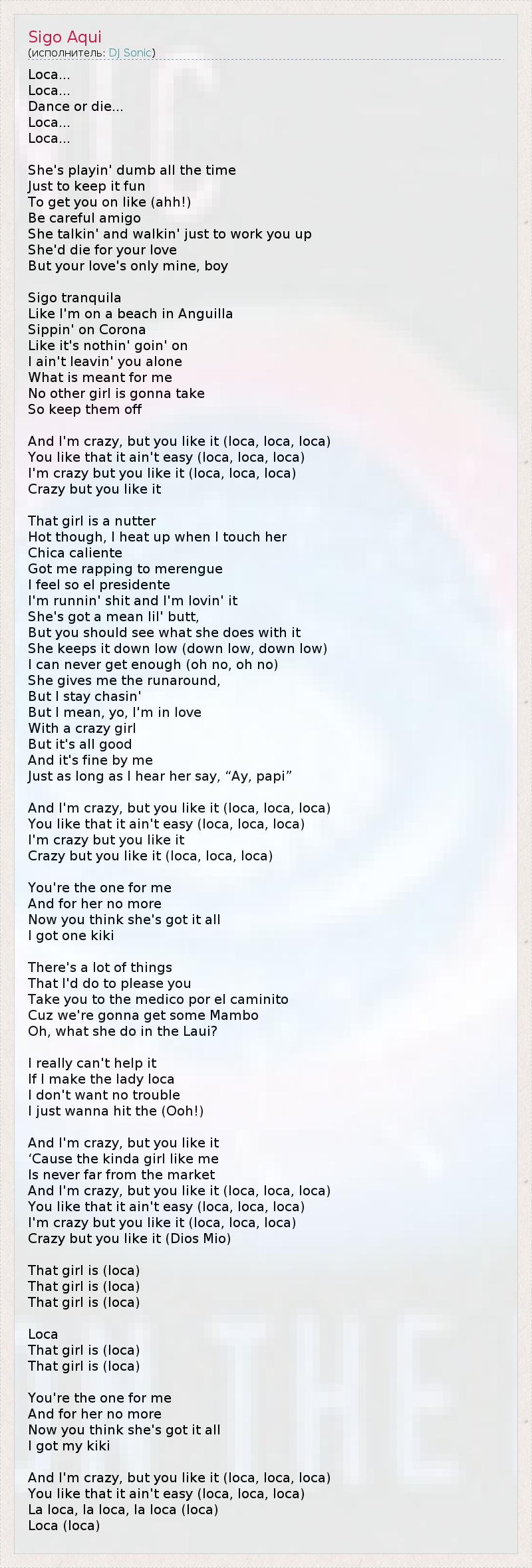 Loca... Loca... Dance or die... Loca... Loca... She's playin' dumb all the time Just to keep it fun To get you on like (ahh!) Be careful amigo She talkin' and walkin' just to work you up She'd die for your love But your love's only mine, boy Sigo tranquila Like I'm on a beach in Anguilla Sippin' on Corona Like it's nothin' goin' on I ain't leavin' you alone What is meant for me No other girl is gonna take So keep them off And I'm crazy, but you like it (loca, loca, loca) You like that it ain't easy (loca, loca, loca) I'm crazy but you like it (loca, loca, loca) Crazy but you like it That girl is a nutter Hot though, I heat up when I touch her Chica caliente Got me rapping to merengue I feel so el presidente I'm runnin' shit and I'm lovin' it She's got a mean lil' butt, But you should see what she does with it She keeps it down low (down low, down low) I can never get enough (oh no, oh no) She gives me the runaround, But I stay chasin' But I mean, yo, I'm in love With a crazy girl But it's all good And it's fine by me Just as long as I hear her say, “Ay, papi” And I'm crazy, but you like it (loca, loca, loca) You like that it ain't easy (loca, loca, loca) I'm crazy but you like it Crazy but you like it (loca, loca, loca) You're the one for me And for her no more Now you think she's got it all I got one kiki There's a lot of things That I'd do to please you Take you to the medico por el caminito Cuz we're gonna get some Mambo Oh, what she do in the Laui? I really can't help it If I make the lady loca I don't want no trouble I just wanna hit the (Ooh!) And I'm crazy, but you like it ‘Cause the kinda girl like me Is never far from the market And I'm crazy, but you like it (loca, loca, loca) You like that it ain't easy (loca, loca, loca) I'm crazy but you like it (loca, loca, loca) Crazy but you like it (Dios Mio) That girl is (loca) That girl is (loca) That girl is (loca) Loca That girl is (loca) That girl is (loca) You're the one for me And for her no more Now you think she's got it all I got my kiki And I'm crazy, but you like it (loca, loca, loca) You like that it ain't easy (loca, loca, loca) La loca, la loca, la loca (loca) Loca (loca)