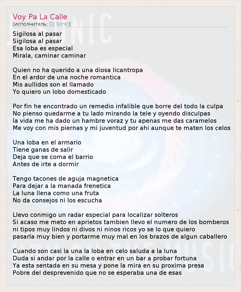 Она проходит мимо украдкой, Она проходит мимо украдкой. Это особенная волчица, Смотри, она идет. Кто не хотел богиню волков Романтическим страстным вечером? Мой вой – это клич, Я хочу приручить волка. Я, наконец, нашла беспроигрышное решение, которое сотрет вину каждого из нас. Я не собираюсь тут оставаться и смотреть ТВ и выслушивать извинения. Жизнь дала мне неугомонный аппетит, а ты едва кормишь меня конфетками. Я ухожу и забираю с собой свою молодость, даже если ты умрешь от ревности. Волчица взаперти, Похоже, выбирается наружу. Позволь ей съесть всех по соседству Перед тем, как ты пойдешь спать. Мои каблуки словно магнитные нити, Которые доводят всех до белого каления. Полная Луна словно фрукт, Не дает советов и не слушает. У меня есть радар, обнаруживающий одиноких парней. И если случайно я попаду в переделку, у меня есть номер спасателей. Не нужны мне ни красивые, ни сладкие, ни богатые мальчики, я знаю, чего хочу: Провести отлично время и побаловаться вместе с мачо. Почти ровно в час ночи волчица оживленно приветствует луну, Она точно не знает просто пройтись ей по улице или испытать удачу в баре. Она уже сидит в осаде и присматривает свою следующую жертву. Бедный паренек, он даже и не ожидает попасться в ловушку подобной девушке.