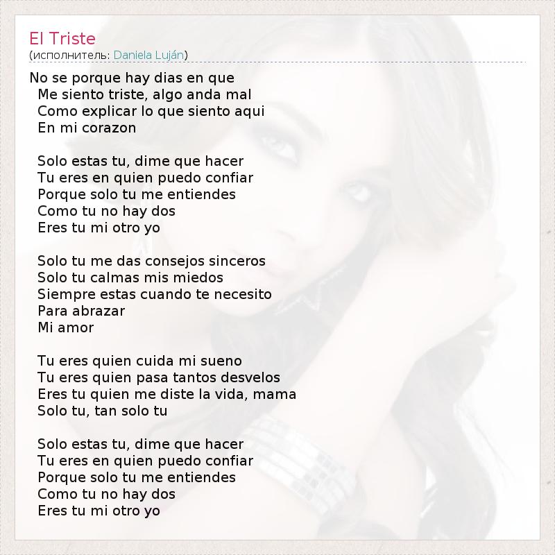 No se porque hay dias en que Me siento triste, algo anda mal Como explicar lo que siento aqui En mi corazon Solo estas tu, dime que hacer Tu eres en quien puedo confiar Porque solo tu me entiendes Como tu no hay dos Eres tu mi otro yo Solo tu me das consejos sinceros Solo tu calmas mis miedos Siempre estas cuando te necesito Para abrazar Mi amor Tu eres quien cuida mi sueno Tu eres quien pasa tantos desvelos Eres tu quien me diste la vida, mama Solo tu, tan solo tu Solo estas tu, dime que hacer Tu eres en quien puedo confiar Porque solo tu me entiendes Como tu no hay dos Eres tu mi otro yo