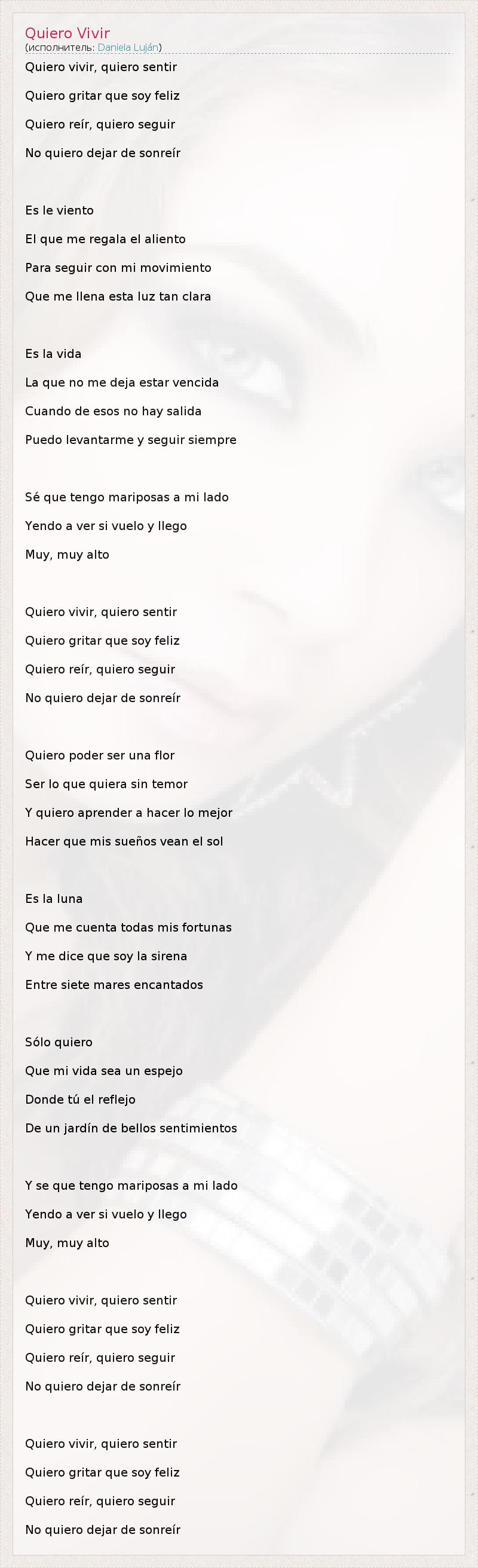 Quiero vivir, quiero sentir Quiero gritar que soy feliz Quiero reír, quiero seguir No quiero dejar de sonreír Es le viento El que me regala el aliento Para seguir con mi movimiento Que me llena esta luz tan clara Es la vida La que no me deja estar vencida Cuando de esos no hay salida Puedo levantarme y seguir siempre Sé que tengo mariposas a mi lado Yendo a ver si vuelo y llego Muy, muy alto Quiero vivir, quiero sentir Quiero gritar que soy feliz Quiero reír, quiero seguir No quiero dejar de sonreír Quiero poder ser una flor Ser lo que quiera sin temor Y quiero aprender a hacer lo mejor Hacer que mis sueños vean el sol Es la luna Que me cuenta todas mis fortunas Y me dice que soy la sirena Entre siete mares encantados Sólo quiero Que mi vida sea un espejo Donde tú el reflejo De un jardín de bellos sentimientos Y se que tengo mariposas a mi lado Yendo a ver si vuelo y llego Muy, muy alto Quiero vivir, quiero sentir Quiero gritar que soy feliz Quiero reír, quiero seguir No quiero dejar de sonreír Quiero vivir, quiero sentir Quiero gritar que soy feliz Quiero reír, quiero seguir No quiero dejar de sonreír