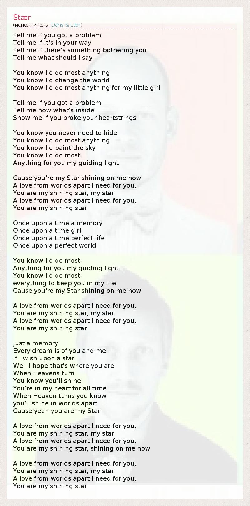 Скажи, если у тебя проблема, Скажи, если она у тебя на пути. Скажи, если что-то тебя тревожит, Скажи, что мне следует сказать. Ты знаешь, я бы сделал всё что угодно. Ты знаешь, я бы изменил мир. Ты знаешь, я бы сделал всё что угодно ради своей девочки. Скажи, если у тебя проблема, Скажи, что внутри - Покажи, не порвала ли ты сердечные струны... Ты знаешь, тебе никогда не нужно прятаться, Ты знаешь, я бы сделал всё что угодно, Ты знаешь, я бы разрисовал небо, Ты знаешь, я бы сделал Что угодно ради тебя, мой путеводный свет... Ведь ты моя звезда, проливающая на меня свой свет, Для тебя мне нужна совершенно иная любовь... Ты моя сияющая звезда, моя звезда, Для тебя мне нужна совершенно иная любовь... Ты моя сияющая звезда... Давнишнее воспоминание: Жила-была девушка Когда-то, когда жизнь была совершенной, А мир идеальным... Ты знаешь, я бы сделал всё Что угодно для тебя, мой путеводный свет. Ты знаешь, я бы сделал всё Что угодно, чтобы удержать в своей жизни, Потому что ты моя звезда, проливающая на меня свой свет... Для тебя мне нужна совершенно иная любовь... Ты моя сияющая звезда, моя звезда, Для тебя мне нужна совершенно иная любовь... Ты моя сияющая звезда... Просто воспоминание... Все сны о нас с тобой. Если я загадаю желание на звезду, Надеюсь, ты окажешься рядом, Когда перевернутся небеса. Ты знаешь, что будешь сиять, Ты навсегда в моём сердце. Когда перевернутся небеса, ты знаешь, Что будешь сиять далеко-далеко от меня, Потому что ты моя звезда... Для тебя мне нужна совершенно иная любовь... Ты моя сияющая звезда, моя звезда, Для тебя мне нужна совершенно иная любовь... Ты моя сияющая звезда, проливающая на меня своей свет... Для тебя мне нужна совершенно иная любовь... Ты моя сияющая звезда, моя звезда, Для тебя мне нужна совершенно иная любовь... Ты моя сияющая звезда...