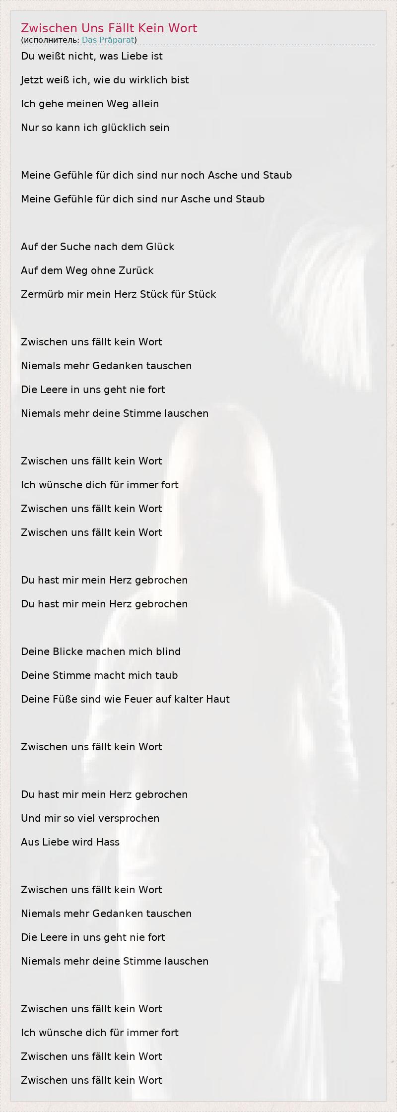 Du weißt nicht, was Liebe ist Jetzt weiß ich, wie du wirklich bist Ich gehe meinen Weg allein Nur so kann ich glücklich sein Meine Gefühle für dich sind nur noch Asche und Staub Meine Gefühle für dich sind nur Asche und Staub Auf der Suche nach dem Glück Auf dem Weg ohne Zurück Zermürb mir mein Herz Stück für Stück Zwischen uns fällt kein Wort Niemals mehr Gedanken tauschen Die Leere in uns geht nie fort Niemals mehr deine Stimme lauschen Zwischen uns fällt kein Wort Ich wünsche dich für immer fort Zwischen uns fällt kein Wort Zwischen uns fällt kein Wort Du hast mir mein Herz gebrochen Du hast mir mein Herz gebrochen Deine Blicke machen mich blind Deine Stimme macht mich taub Deine Füße sind wie Feuer auf kalter Haut Zwischen uns fällt kein Wort Du hast mir mein Herz gebrochen Und mir so viel versprochen Aus Liebe wird Hass Zwischen uns fällt kein Wort Niemals mehr Gedanken tauschen Die Leere in uns geht nie fort Niemals mehr deine Stimme lauschen Zwischen uns fällt kein Wort Ich wünsche dich für immer fort Zwischen uns fällt kein Wort Zwischen uns fällt kein Wort