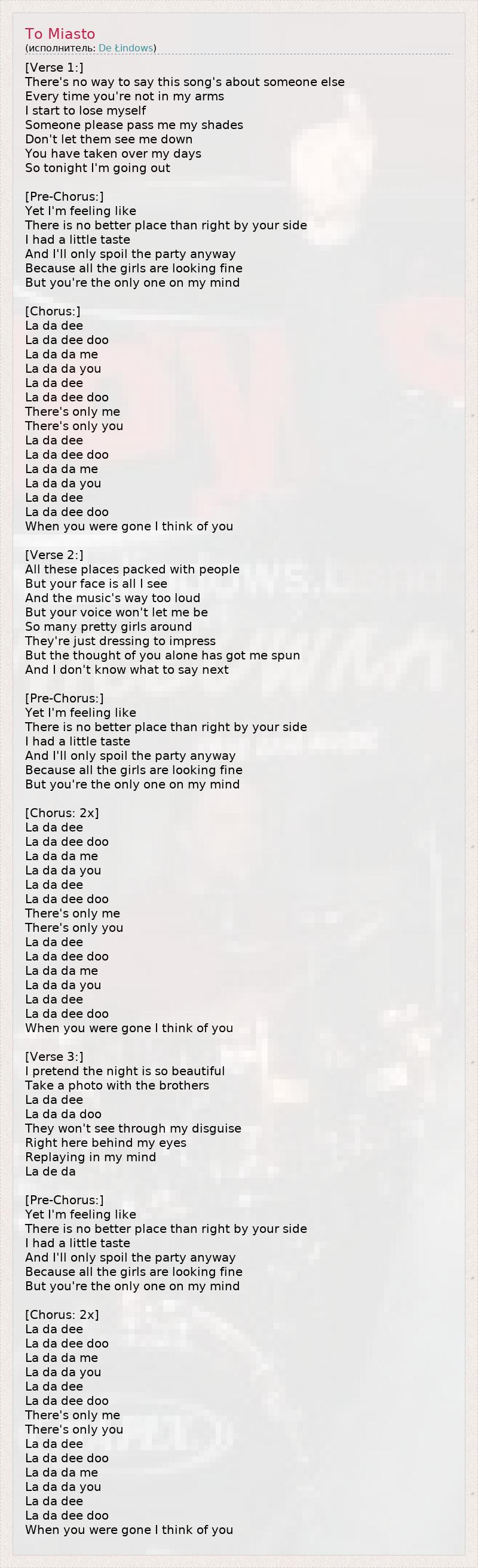 [Verse 1:] There's no way to say this song's about someone else Every time you're not in my arms I start to lose myself Someone please pass me my shades Don't let them see me down You have taken over my days So tonight I'm going out [Pre-Chorus:] Yet I'm feeling like There is no better place than right by your side I had a little taste And I'll only spoil the party anyway Because all the girls are looking fine But you're the only one on my mind [Chorus:] La da dee La da dee doo La da da me La da da you La da dee La da dee doo There's only me There's only you La da dee La da dee doo La da da me La da da you La da dee La da dee doo When you were gone I think of you [Verse 2:] All these places packed with people But your face is all I see And the music's way too loud But your voice won't let me be So many pretty girls around They're just dressing to impress But the thought of you alone has got me spun And I don't know what to say next [Pre-Chorus:] Yet I'm feeling like There is no better place than right by your side I had a little taste And I'll only spoil the party anyway Because all the girls are looking fine But you're the only one on my mind [Chorus: 2x] La da dee La da dee doo La da da me La da da you La da dee La da dee doo There's only me There's only you La da dee La da dee doo La da da me La da da you La da dee La da dee doo When you were gone I think of you [Verse 3:] I pretend the night is so beautiful Take a photo with the brothers La da dee La da da doo They won't see through my disguise Right here behind my eyes Replaying in my mind La de da [Pre-Chorus:] Yet I'm feeling like There is no better place than right by your side I had a little taste And I'll only spoil the party anyway Because all the girls are looking fine But you're the only one on my mind [Chorus: 2x] La da dee La da dee doo La da da me La da da you La da dee La da dee doo There's only me There's only you La da dee La da dee doo La da da me La da da you La da dee La da dee doo When you were gone I think of you