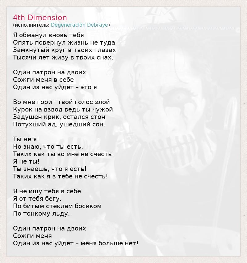 Я обманул вновь тебя Опять повернул жизнь не туда Замкнутый круг в твоих глазах Тысячи лет живу в твоих снах. Один патрон на двоих Сожги меня в себе Один из нас уйдет – это я. Во мне горит твой голос злой Курок на взвод ведь ты чужой Задушен крик, остался стон Потухший ад, ушедший сон. Ты не я! Но знаю, что ты есть. Таких как ты во мне не счесть! Я не ты! Ты знаешь, что я есть! Таких как я в тебе не счесть! Я не ищу тебя в себе Я от тебя бегу. По битым стеклам босиком По тонкому льду. Один патрон на двоих Сожги меня Один из нас уйдет – меня больше нет!
