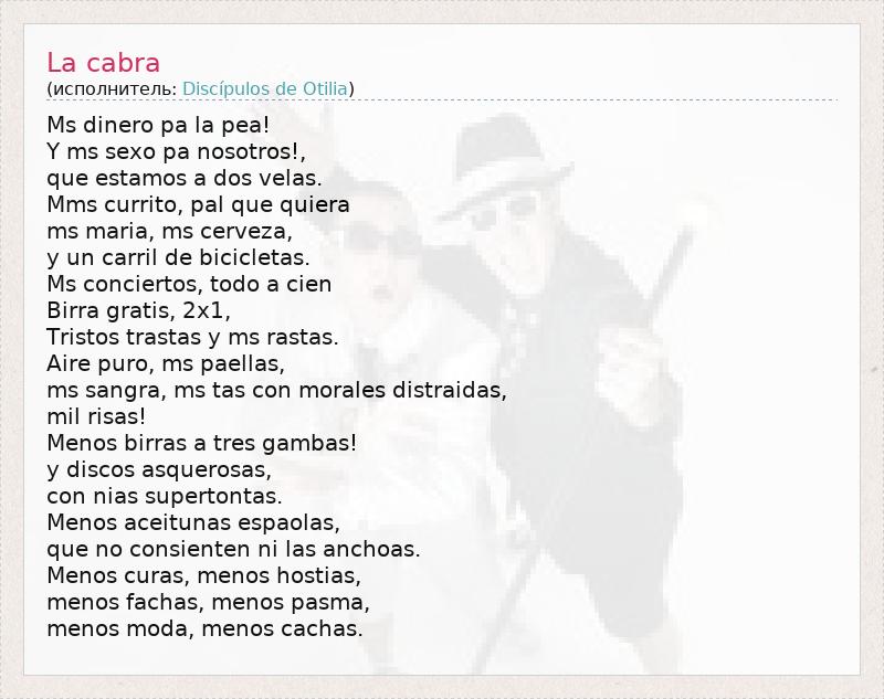 Ms dinero pa la pea! Y ms sexo pa nosotros!, que estamos a dos velas. Mms currito, pal que quiera ms maria, ms cerveza, y un carril de bicicletas. Ms conciertos, todo a cien Birra gratis, 2x1, Tristos trastas y ms rastas. Aire puro, ms paellas, ms sangra, ms tas con morales distraidas, mil risas! Menos birras a tres gambas! y discos asquerosas, con nias supertontas. Menos aceitunas espaolas, que no consienten ni las anchoas. Menos curas, menos hostias, menos fachas, menos pasma, menos moda, menos cachas.