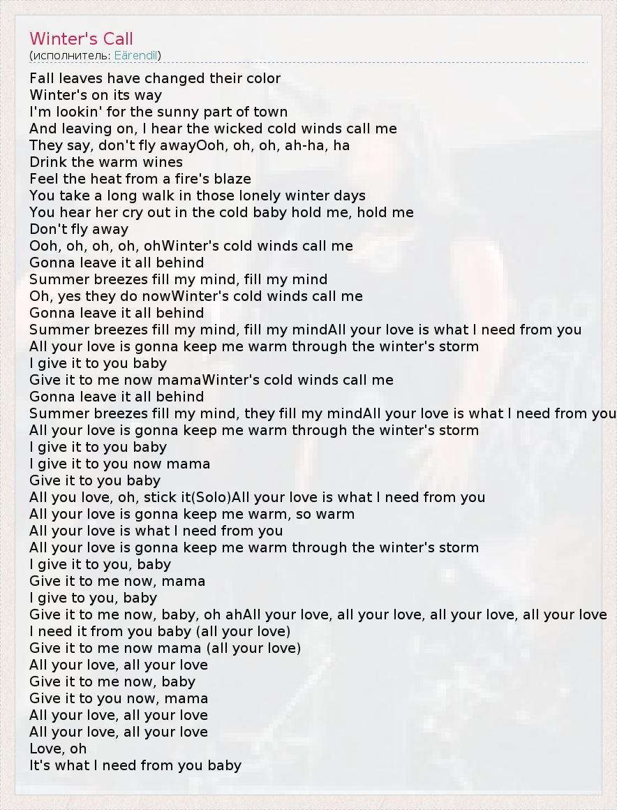 Fall leaves have changed their color Winter's on its way I'm lookin' for the sunny part of town And leaving on, I hear the wicked cold winds call me They say, don't fly awayOoh, oh, oh, ah-ha, ha Drink the warm wines Feel the heat from a fire's blaze You take a long walk in those lonely winter days You hear her cry out in the cold baby hold me, hold me Don't fly away Ooh, oh, oh, oh, ohWinter's cold winds call me Gonna leave it all behind Summer breezes fill my mind, fill my mind Oh, yes they do nowWinter's cold winds call me Gonna leave it all behind Summer breezes fill my mind, fill my mindAll your love is what I need from you All your love is gonna keep me warm through the winter's storm I give it to you baby Give it to me now mamaWinter's cold winds call me Gonna leave it all behind Summer breezes fill my mind, they fill my mindAll your love is what I need from you All your love is gonna keep me warm through the winter's storm I give it to you baby I give it to you now mama Give it to you baby All you love, oh, stick it(Solo)All your love is what I need from you All your love is gonna keep me warm, so warm All your love is what I need from you All your love is gonna keep me warm through the winter's storm I give it to you, baby Give it to me now, mama I give to you, baby Give it to me now, baby, oh ahAll your love, all your love, all your love, all your love I need it from you baby (all your love) Give it to me now mama (all your love) All your love, all your love Give it to me now, baby Give it to you now, mama All your love, all your love All your love, all your love Love, oh It's what I need from you baby