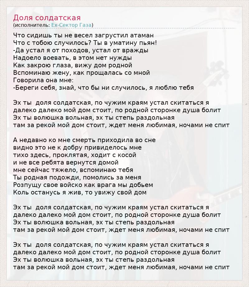 Что сидишь ты не весел загрустил атаман Что с тобою случилось? Ты в уматину пьян! -Да устал я от походов, устал от вражды Надоело воевать, в этом нет нужды Как закрою глаза, вижу дом родной Вспоминаю жену, как прощалась со мной Говорила она мне: -Береги себя, знай, что бы ни случилось, я люблю тебя Эх ты доля солдатская, по чужим краям устал скитаться я далеко далеко мой дом стоит, по родной сторонке душа болит Эх ты волюшка вольная, эх ты степь раздольная там за рекой мой дом стоит, ждет меня любимая, ночами не спит А недавно ко мне смерть приходила во сне видно это не к добру привиделось мне тихо здесь, проклятая, ходит с косой и не все ребята вернутся домой мне сейчас тяжело, вспоминаю тебя Ты родная подожди, помолись за меня Розпущу свое войско как врага мы добьем Коль останусь я жив, то увижу свой дом Эх ты доля солдатская, по чужим краям устал скитаться я далеко далеко мой дом стоит, по родной сторонке душа болит Эх ты волюшка вольная, эх ты степь раздольная там за рекой мой дом стоит, ждет меня любимая, ночами не спит Эх ты доля солдатская, по чужим краям устал скитаться я далеко далеко мой дом стоит, по родной сторонке душа болит Эх ты волюшка вольная, эх ты степь раздольная там за рекой мой дом стоит, ждет меня любимая, ночами не спит