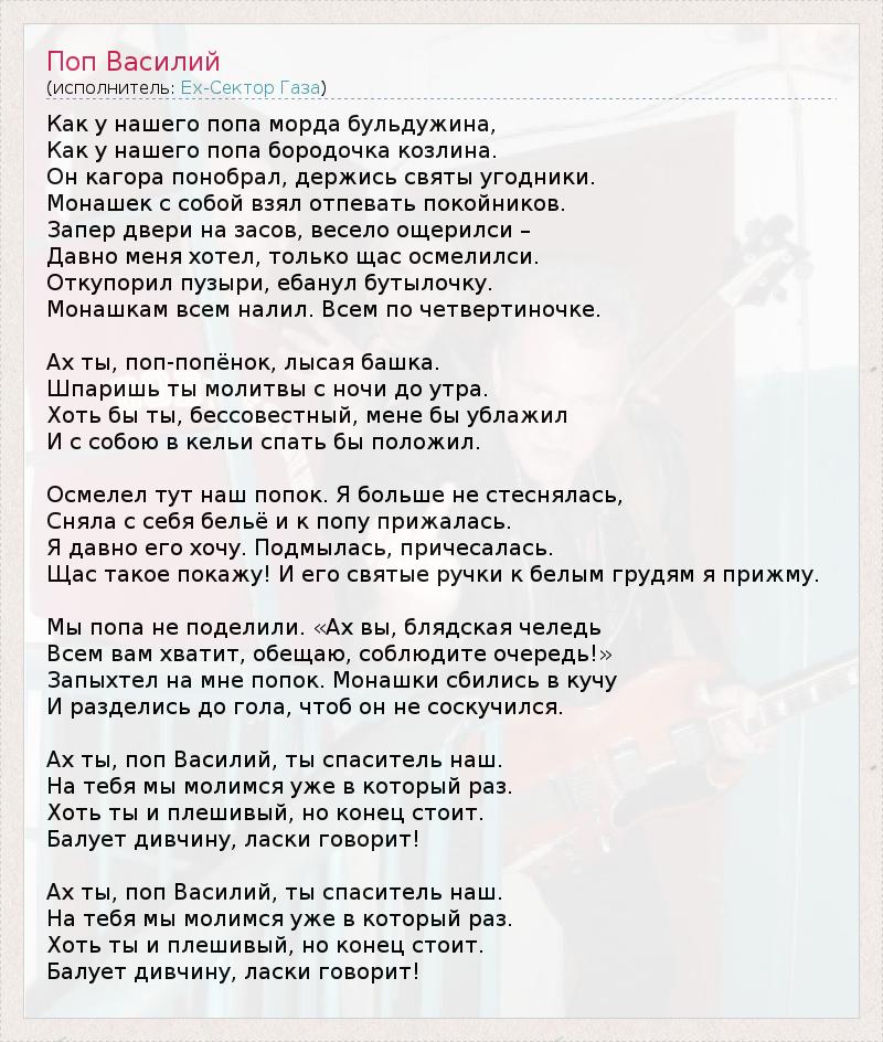 Как у нашего попа морда бульдужина, Как у нашего попа бородочка козлина. Он кагора понобрал, держись святы угодники. Монашек с собой взял отпевать покойников. Запер двери на засов, весело ощерилси – Давно меня хотел, только щас осмелилси. Откупорил пузыри, ебанул бутылочку. Монашкам всем налил. Всем по четвертиночке. Ах ты, поп-попёнок, лысая башка. Шпаришь ты молитвы с ночи до утра. Хоть бы ты, бессовестный, мене бы ублажил И с собою в кельи спать бы положил. Осмелел тут наш попок. Я больше не стеснялась, Сняла с себя бельё и к попу прижалась. Я давно его хочу. Подмылась, причесалась. Щас такое покажу! И его святые ручки к белым грудям я прижму. Мы попа не поделили. «Ах вы, блядская челедь Всем вам хватит, обещаю, соблюдите очередь!» Запыхтел на мне попок. Монашки сбились в кучу И разделись до гола, чтоб он не соскучился. Ах ты, поп Василий, ты спаситель наш. На тебя мы молимся уже в который раз. Хоть ты и плешивый, но конец стоит. Балует дивчину, ласки говорит! Ах ты, поп Василий, ты спаситель наш. На тебя мы молимся уже в который раз. Хоть ты и плешивый, но конец стоит. Балует дивчину, ласки говорит!