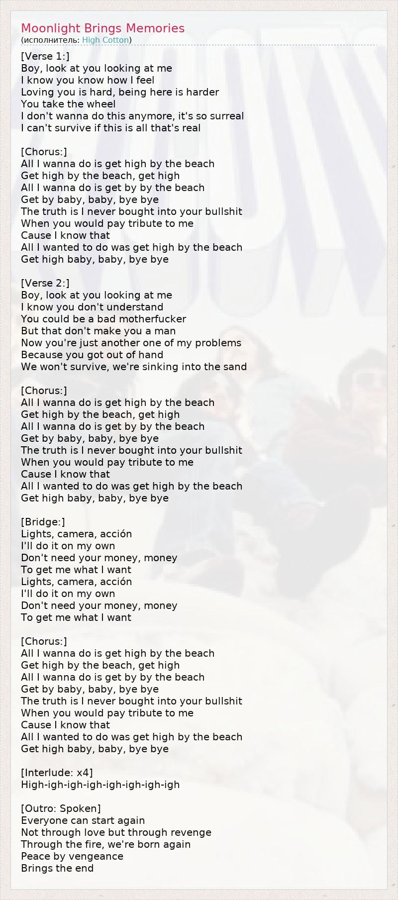 [1-ый куплет:] Малыш, ловлю на себе твой взгляд, Знаю, ты знаешь, что я чувствую. Любить тебя непросто, а находиться здесь ещё труднее. Ты встаёшь у штурвала, Я больше не хочу так, всё слишком нереально, Я не переживу, если это всё по-настоящему. [Припев:] Всё, чего я хочу - поймать кайф на пляже, Поймать кайф на пляже, поймать кайф. Всё, чего я хочу - оказаться на пляже, На пляже, малыш, так что пока! Правда в том, что я никогда не верила в твою чепуху, Когда ты нахваливал меня. Потому что я знаю, что Всё, чего мне хотелось - поймать кайф на пляже, Поймать кайф, малыш, пока-пока! [2-ой куплет:] Малыш, ловлю на себе твой взгляд. Знаю, ты не понимаешь: Ты можешь быть настоящим подонком, Но это не делает тебя мужчиной. Теперь ты просто одна из моих проблем, Ведь ты вышел из-под контроля. Нам не выжить, мы увязли в зыбучих песках. [Припев:] Всё, чего я хочу - поймать кайф на пляже, Поймать кайф на пляже, поймать кайф. Всё, чего я хочу - оказаться на пляже, На пляже, малыш, так что пока! Правда в том, что я никогда не верила в твою чепуху, Когда ты нахваливал меня. Потому что я знаю, что Всё, чего мне хотелось - поймать кайф на пляже, Поймать кайф, малыш, пока-пока! [Связка:] Свет, камера, мотор! Я справлюсь сама, Мне не нужны твои деньги, Чтобы получить то, чего я хочу. Свет, камера, мотор! Я справлюсь сама, Мне не нужны твои деньги, Чтобы получить то, чего я хочу. [Припев:] Всё, чего я хочу - поймать кайф на пляже. Поймать кайф на пляже, поймать кайф. Всё, чего я хочу - оказаться на пляже, На пляже, малыш, так что пока! Правда в том, что я никогда не верила в твою чепуху, Когда ты нахваливал меня. Потому что я знаю, что Всё, чего мне хотелось - поймать кайф на пляже, Поймать кайф, малыш, пока-пока! [Проигрыш: x4] Кайф-кайф-кайф-кайф... [Концовка:] Каждый может начать с начала, И не с любовью, а с местью. В огне мы возрождаемся вновь, Отмщённый мир Приносит развязку.