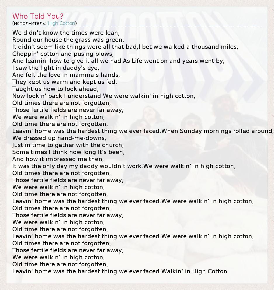We didn't know the times were lean, Round our house the grass was green, It didn't seem like things were all that bad,I bet we walked a thousand miles, Choppin' cotton and pusing plows, And learnin' how to give it all we had.As Life went on and years went by, I saw the light in daddy's eye, And felt the love in mamma's hands, They kept us warm and kept us fed, Taught us how to look ahead, Now lookin' back I understand.We were walkin' in high cotton, Old times there are not forgotten, Those fertile fields are never far away, We were walkin' in high cotton, Old time there are not forgotten, Leavin' home was the hardest thing we ever faced.When Sunday mornings rolled around, We dressed up hand-me-downs, Just in time to gather with the church, Some times I think how long It's been, And how it impressed me then, It was the only day my daddy wouldn't work.We were walkin' in high cotton, Old times there are not forgotten, Those fertile fields are never far away, We were walkin' in high cotton, Old time there are not forgotten, Leavin' home was the hardest thing we ever faced.We were walkin' in high cotton, Old times there are not forgotten, Those fertile fields are never far away, We were walkin' in high cotton, Old time there are not forgotten, Leavin' home was the hardest thing we ever faced.We were walkin' in high cotton, Old times there are not forgotten, Those fertile fields are never far away, We were walkin' in high cotton, Old time there are not forgotten, Leavin' home was the hardest thing we ever faced.Walkin' in High Cotton