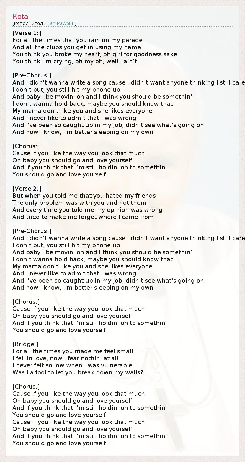 [Verse 1:] For all the times that you rain on my parade And all the clubs you get in using my name You think you broke my heart, oh girl for goodness sake You think I'm crying, oh my oh, well I ain't [Pre-Chorus:] And I didn't wanna write a song cause I didn't want anyone thinking I still care I don't but, you still hit my phone up And baby I be movin' on and I think you should be somethin' I don't wanna hold back, maybe you should know that My mama don't like you and she likes everyone And I never like to admit that I was wrong And I've been so caught up in my job, didn't see what's going on And now I know, I'm better sleeping on my own [Chorus:] Cause if you like the way you look that much Oh baby you should go and love yourself And if you think that I'm still holdin' on to somethin' You should go and love yourself [Verse 2:] But when you told me that you hated my friends The only problem was with you and not them And every time you told me my opinion was wrong And tried to make me forget where I came from [Pre-Chorus:] And I didn't wanna write a song cause I didn't want anyone thinking I still care I don't but, you still hit my phone up And baby I be movin' on and I think you should be somethin' I don't wanna hold back, maybe you should know that My mama don't like you and she likes everyone And I never like to admit that I was wrong And I've been so caught up in my job, didn't see what's going on And now I know, I'm better sleeping on my own [Chorus:] Cause if you like the way you look that much Oh baby you should go and love yourself And if you think that I'm still holdin' on to somethin' You should go and love yourself [Bridge:] For all the times you made me feel small I fell in love, now I fear nothin' at all I never felt so low when I was vulnerable Was I a fool to let you break down my walls? [Chorus:] Cause if you like the way you look that much Oh baby you should go and love yourself And if you think that I'm still holdin' on to somethin' You should go and love yourself Cause if you like the way you look that much Oh baby you should go and love yourself And if you think that I'm still holdin' on to somethin' You should go and love yourself