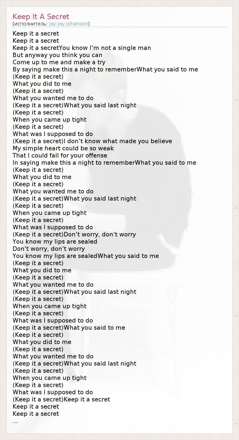 Keep it a secret Keep it a secret Keep it a secretYou know I'm not a single man But anyway you think you can Come up to me and make a try By saying make this a night to rememberWhat you said to me (Keep it a secret) What you did to me (Keep it a secret) What you wanted me to do (Keep it a secret)What you said last night (Keep it a secret) When you came up tight (Keep it a secret) What was I supposed to do (Keep it a secret)I don't know what made you believe My simple heart could be so weak That I could fall for your offense In saying make this a night to rememberWhat you said to me (Keep it a secret) What you did to me (Keep it a secret) What you wanted me to do (Keep it a secret)What you said last night (Keep it a secret) When you came up tight (Keep it a secret) What was I supposed to do (Keep it a secret)Don't worry, don't worry You know my lips are sealed Don't worry, don't worry You know my lips are sealedWhat you said to me (Keep it a secret) What you did to me (Keep it a secret) What you wanted me to do (Keep it a secret)What you said last night (Keep it a secret) When you came up tight (Keep it a secret) What was I supposed to do (Keep it a secret)What you said to me (Keep it a secret) What you did to me (Keep it a secret) What you wanted me to do (Keep it a secret)What you said last night (Keep it a secret) When you came up tight (Keep it a secret) What was I supposed to do (Keep it a secret)Keep it a secret Keep it a secret Keep it a secret ...