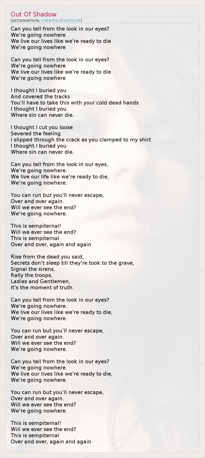 Видно ли по нашим глазам, Что мы идем в никуда? Живем так, словно готовы умереть, Мы идем в никуда. Видно ли по нашим глазам, Что мы идем в никуда? Живем так, словно готовы умереть, Мы идем в никуда. Я думал, что похоронил тебя И замел следы. Тебе придётся принять это, хоть ты уже мертва. 1 Я думал, что похоронил тебя, Где грех никогда не умрет. Я думал, что освободился от тебя, Избавился от чувств. Я провалился в трещину, когда ты цеплялась за мой рукав. Я думал, что похоронил тебя там, Где грех никогда не умрет. Видно ли по нашим глазам, Что мы идем в никуда? Живем так, словно готовы умереть, Мы идем в никуда. Ты можешь бежать, но тебе не вырваться, Снова и снова... Будет ли этому конец? Мы идем в никуда... Это бесконечно! Мы когда-нибудь увидим конец? Это бесконечно! Снова и снова, опять и опять... Восстав из мертвых, ты сказала: "Секреты не спят, пока их не унесут в могилу. Бейте тревогу, Созывайте войска! Леди и джентльмены, Настал момент истины!" Видно ли по нашим глазам, Что мы идем в никуда? Живем так, словно готовы умереть, Мы идем в никуда. Ты можешь бежать, но тебе не вырваться, Снова и снова... Будет ли этому конец? Мы идем в никуда... Видно ли по нашим глазам, Что мы идем в никуда? Живем так, словно готовы умереть, Мы идем в никуда. Ты можешь бежать, но тебе не вырваться, Снова и снова... Будет ли этому конец? Мы идем в никуда... Это бесконечно! Мы когда-нибудь увидим конец? Это бесконечно! Снова и снова, опять и опять... 1 - дословно: тебе придётся взять это своими ледяными как у мертвеца руками