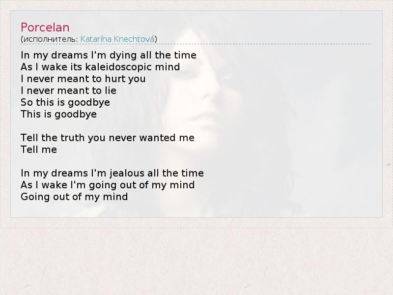 In my dreams I'm dying all the time As I wake its kaleidoscopic mind I never meant to hurt you I never meant to lie So this is goodbye This is goodbye Tell the truth you never wanted me Tell me In my dreams I'm jealous all the time As I wake I'm going out of my mind Going out of my mind