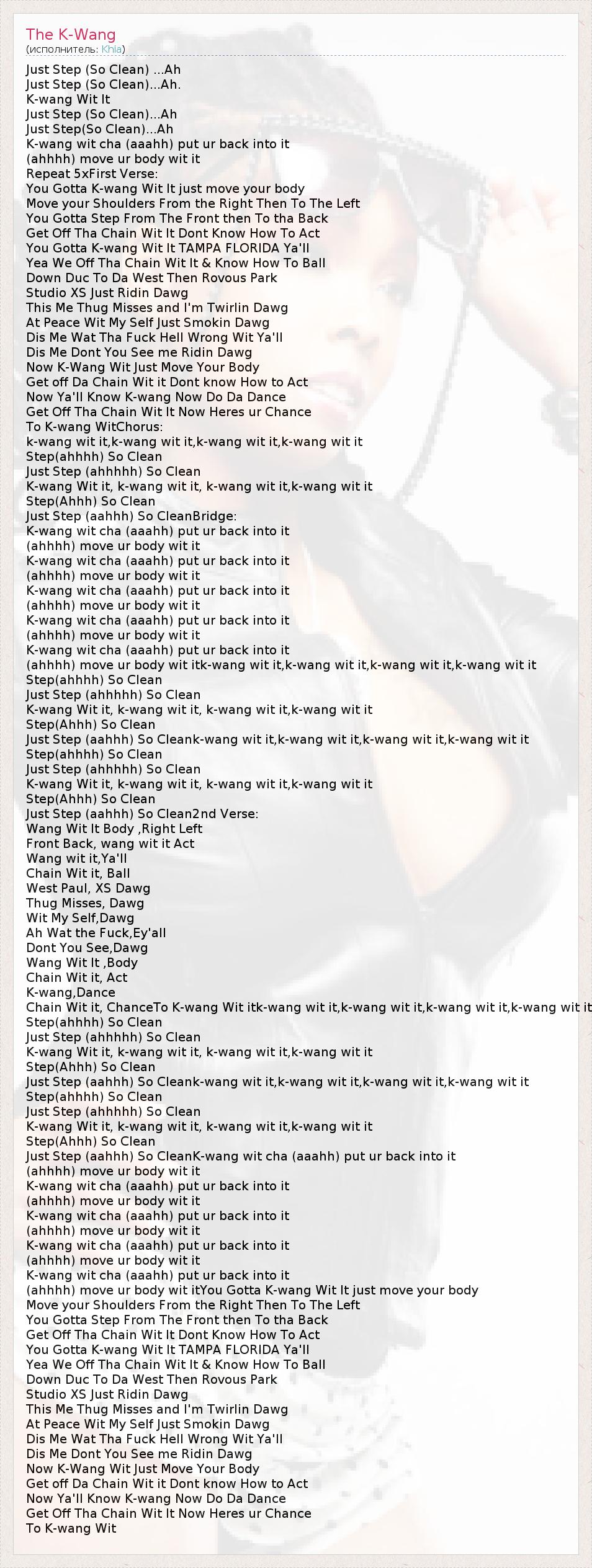 Just Step (So Clean) ...Ah Just Step (So Clean)...Ah. K-wang Wit It Just Step (So Clean)...Ah Just Step(So Clean)...Ah K-wang wit cha (aaahh) put ur back into it (ahhhh) move ur body wit it Repeat 5xFirst Verse: You Gotta K-wang Wit It just move your body Move your Shoulders From the Right Then To The Left You Gotta Step From The Front then To tha Back Get Off Tha Chain Wit It Dont Know How To Act You Gotta K-wang Wit It TAMPA FLORIDA Ya'll Yea We Off Tha Chain Wit It & Know How To Ball Down Duc To Da West Then Rovous Park Studio XS Just Ridin Dawg This Me Thug Misses and I'm Twirlin Dawg At Peace Wit My Self Just Smokin Dawg Dis Me Wat Tha Fuck Hell Wrong Wit Ya'll Dis Me Dont You See me Ridin Dawg Now K-Wang Wit Just Move Your Body Get off Da Chain Wit it Dont know How to Act Now Ya'll Know K-wang Now Do Da Dance Get Off Tha Chain Wit It Now Heres ur Chance To K-wang WitChorus: k-wang wit it,k-wang wit it,k-wang wit it,k-wang wit it Step(ahhhh) So Clean Just Step (ahhhhh) So Clean K-wang Wit it, k-wang wit it, k-wang wit it,k-wang wit it Step(Ahhh) So Clean Just Step (aahhh) So CleanBridge: K-wang wit cha (aaahh) put ur back into it (ahhhh) move ur body wit it K-wang wit cha (aaahh) put ur back into it (ahhhh) move ur body wit it K-wang wit cha (aaahh) put ur back into it (ahhhh) move ur body wit it K-wang wit cha (aaahh) put ur back into it (ahhhh) move ur body wit it K-wang wit cha (aaahh) put ur back into it (ahhhh) move ur body wit itk-wang wit it,k-wang wit it,k-wang wit it,k-wang wit it Step(ahhhh) So Clean Just Step (ahhhhh) So Clean K-wang Wit it, k-wang wit it, k-wang wit it,k-wang wit it Step(Ahhh) So Clean Just Step (aahhh) So Cleank-wang wit it,k-wang wit it,k-wang wit it,k-wang wit it Step(ahhhh) So Clean Just Step (ahhhhh) So Clean K-wang Wit it, k-wang wit it, k-wang wit it,k-wang wit it Step(Ahhh) So Clean Just Step (aahhh) So Clean2nd Verse: Wang Wit It Body ,Right Left Front Back, wang wit it Act Wang wit it,Ya'll Chain Wit it, Ball West Paul, XS Dawg Thug Misses, Dawg Wit My Self,Dawg Ah Wat the Fuck,Ey'all Dont You See,Dawg Wang Wit It ,Body Chain Wit it, Act K-wang,Dance Chain Wit it, ChanceTo K-wang Wit itk-wang wit it,k-wang wit it,k-wang wit it,k-wang wit it Step(ahhhh) So Clean Just Step (ahhhhh) So Clean K-wang Wit it, k-wang wit it, k-wang wit it,k-wang wit it Step(Ahhh) So Clean Just Step (aahhh) So Cleank-wang wit it,k-wang wit it,k-wang wit it,k-wang wit it Step(ahhhh) So Clean Just Step (ahhhhh) So Clean K-wang Wit it, k-wang wit it, k-wang wit it,k-wang wit it Step(Ahhh) So Clean Just Step (aahhh) So CleanK-wang wit cha (aaahh) put ur back into it (ahhhh) move ur body wit it K-wang wit cha (aaahh) put ur back into it (ahhhh) move ur body wit it K-wang wit cha (aaahh) put ur back into it (ahhhh) move ur body wit it K-wang wit cha (aaahh) put ur back into it (ahhhh) move ur body wit it K-wang wit cha (aaahh) put ur back into it (ahhhh) move ur body wit itYou Gotta K-wang Wit It just move your body Move your Shoulders From the Right Then To The Left You Gotta Step From The Front then To tha Back Get Off Tha Chain Wit It Dont Know How To Act You Gotta K-wang Wit It TAMPA FLORIDA Ya'll Yea We Off Tha Chain Wit It & Know How To Ball Down Duc To Da West Then Rovous Park Studio XS Just Ridin Dawg This Me Thug Misses and I'm Twirlin Dawg At Peace Wit My Self Just Smokin Dawg Dis Me Wat Tha Fuck Hell Wrong Wit Ya'll Dis Me Dont You See me Ridin Dawg Now K-Wang Wit Just Move Your Body Get off Da Chain Wit it Dont know How to Act Now Ya'll Know K-wang Now Do Da Dance Get Off Tha Chain Wit It Now Heres ur Chance To K-wang Wit