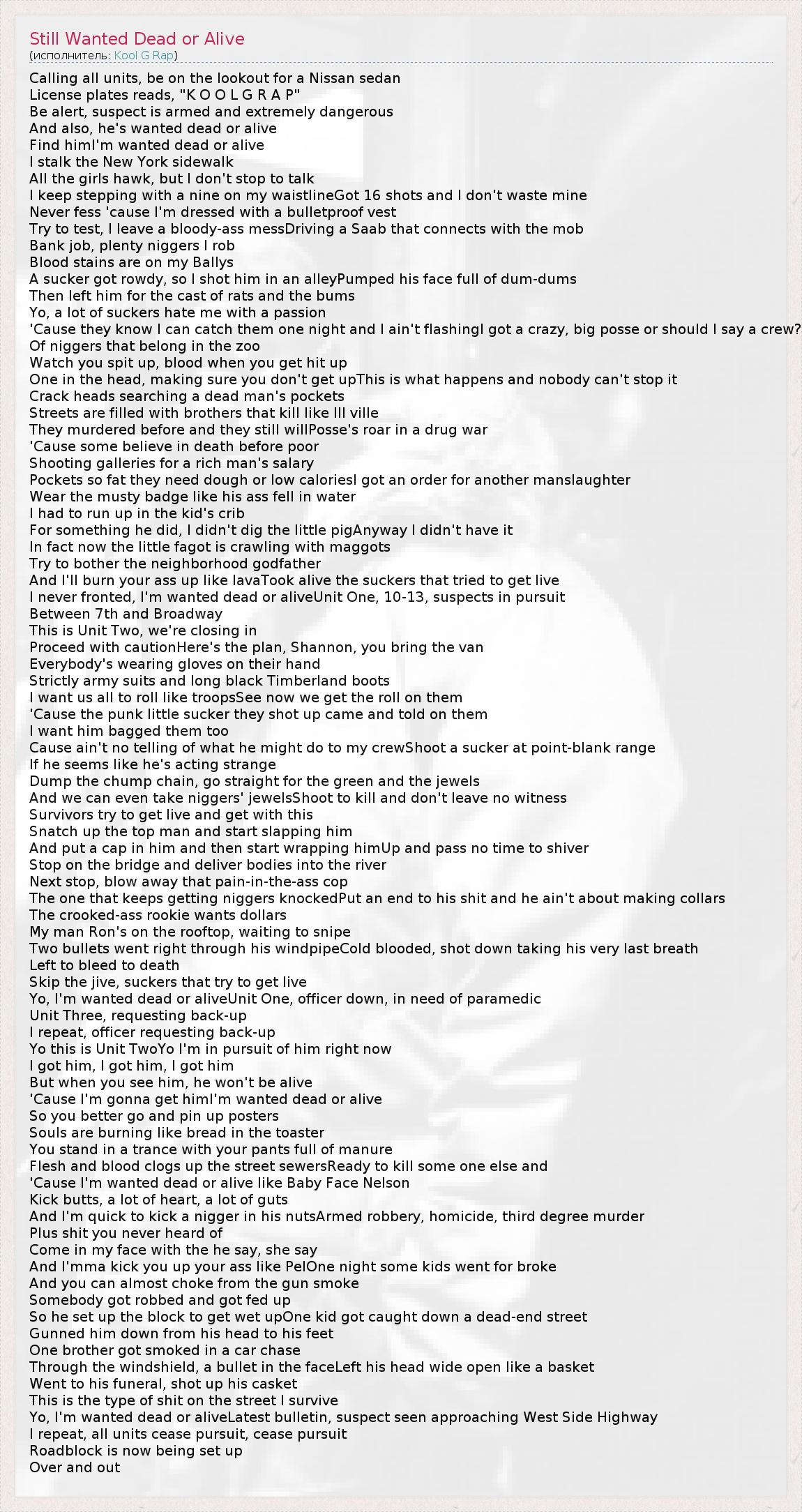 Calling all units, be on the lookout for a Nissan sedan License plates reads, "K O O L G R A P" Be alert, suspect is armed and extremely dangerous And also, he's wanted dead or alive Find himI'm wanted dead or alive I stalk the New York sidewalk All the girls hawk, but I don't stop to talk I keep stepping with a nine on my waistlineGot 16 shots and I don't waste mine Never fess 'cause I'm dressed with a bulletproof vest Try to test, I leave a bloody-ass messDriving a Saab that connects with the mob Bank job, plenty niggers I rob Blood stains are on my Ballys A sucker got rowdy, so I shot him in an alleyPumped his face full of dum-dums Then left him for the cast of rats and the bums Yo, a lot of suckers hate me with a passion 'Cause they know I can catch them one night and I ain't flashingI got a crazy, big posse or should I say a crew? Of niggers that belong in the zoo Watch you spit up, blood when you get hit up One in the head, making sure you don't get upThis is what happens and nobody can't stop it Crack heads searching a dead man's pockets Streets are filled with brothers that kill like Ill ville They murdered before and they still willPosse's roar in a drug war 'Cause some believe in death before poor Shooting galleries for a rich man's salary Pockets so fat they need dough or low caloriesI got an order for another manslaughter Wear the musty badge like his ass fell in water I had to run up in the kid's crib For something he did, I didn't dig the little pigAnyway I didn't have it In fact now the little fagot is crawling with maggots Try to bother the neighborhood godfather And I'll burn your ass up like lavaTook alive the suckers that tried to get live I never fronted, I'm wanted dead or aliveUnit One, 10-13, suspects in pursuit Between 7th and Broadway This is Unit Two, we're closing in Proceed with cautionHere's the plan, Shannon, you bring the van Everybody's wearing gloves on their hand Strictly army suits and long black Timberland boots I want us all to roll like troopsSee now we get the roll on them 'Cause the punk little sucker they shot up came and told on them I want him bagged them too Cause ain't no telling of what he might do to my crewShoot a sucker at point-blank range If he seems like he's acting strange Dump the chump chain, go straight for the green and the jewels And we can even take niggers' jewelsShoot to kill and don't leave no witness Survivors try to get live and get with this Snatch up the top man and start slapping him And put a cap in him and then start wrapping himUp and pass no time to shiver Stop on the bridge and deliver bodies into the river Next stop, blow away that pain-in-the-ass cop The one that keeps getting niggers knockedPut an end to his shit and he ain't about making collars The crooked-ass rookie wants dollars My man Ron's on the rooftop, waiting to snipe Two bullets went right through his windpipeCold blooded, shot down taking his very last breath Left to bleed to death Skip the jive, suckers that try to get live Yo, I'm wanted dead or aliveUnit One, officer down, in need of paramedic Unit Three, requesting back-up I repeat, officer requesting back-up Yo this is Unit TwoYo I'm in pursuit of him right now I got him, I got him, I got him But when you see him, he won't be alive 'Cause I'm gonna get himI'm wanted dead or alive So you better go and pin up posters Souls are burning like bread in the toaster You stand in a trance with your pants full of manure Flesh and blood clogs up the street sewersReady to kill some one else and 'Cause I'm wanted dead or alive like Baby Face Nelson Kick butts, a lot of heart, a lot of guts And I'm quick to kick a nigger in his nutsArmed robbery, homicide, third degree murder Plus shit you never heard of Come in my face with the he say, she say And I'mma kick you up your ass like PelOne night some kids went for broke And you can almost choke from the gun smoke Somebody got robbed and got fed up So he set up the block to get wet upOne kid got caught down a dead-end street Gunned him down from his head to his feet One brother got smoked in a car chase Through the windshield, a bullet in the faceLeft his head wide open like a basket Went to his funeral, shot up his casket This is the type of shit on the street I survive Yo, I'm wanted dead or aliveLatest bulletin, suspect seen approaching West Side Highway I repeat, all units cease pursuit, cease pursuit Roadblock is now being set up Over and out