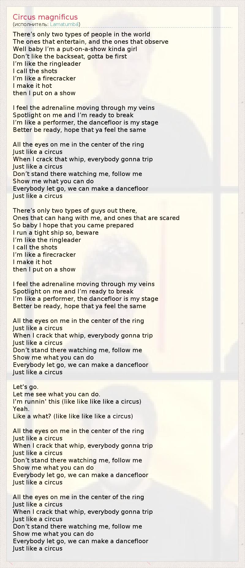 There’s only two types of people in the world The ones that entertain, and the ones that observe Well baby I’m a put-on-a-show kinda girl Don’t like the backseat, gotta be first I’m like the ringleader I call the shots I’m like a firecracker I make it hot then I put on a show I feel the adrenaline moving through my veins Spotlight on me and I’m ready to break I’m like a performer, the dancefloor is my stage Better be ready, hope that ya feel the same All the eyes on me in the center of the ring Just like a circus When I crack that whip, everybody gonna trip Just like a circus Don’t stand there watching me, follow me Show me what you can do Everybody let go, we can make a dancefloor Just like a circus There’s only two types of guys out there, Ones that can hang with me, and ones that are scared So baby I hope that you came prepared I run a tight ship so, beware I’m like the ringleader I call the shots I’m like a firecracker I make it hot then I put on a show I feel the adrenaline moving through my veins Spotlight on me and I’m ready to break I’m like a performer, the dancefloor is my stage Better be ready, hope that ya feel the same All the eyes on me in the center of the ring Just like a circus When I crack that whip, everybody gonna trip Just like a circus Don’t stand there watching me, follow me Show me what you can do Everybody let go, we can make a dancefloor Just like a circus Let's go. Let me see what you can do. I'm runnin' this (like like like like a circus) Yeah. Like a what? (like like like like a circus) All the eyes on me in the center of the ring Just like a circus When I crack that whip, everybody gonna trip Just like a circus Don’t stand there watching me, follow me Show me what you can do Everybody let go, we can make a dancefloor Just like a circus All the eyes on me in the center of the ring Just like a circus When I crack that whip, everybody gonna trip Just like a circus Don’t stand there watching me, follow me Show me what you can do Everybody let go, we can make a dancefloor Just like a circus