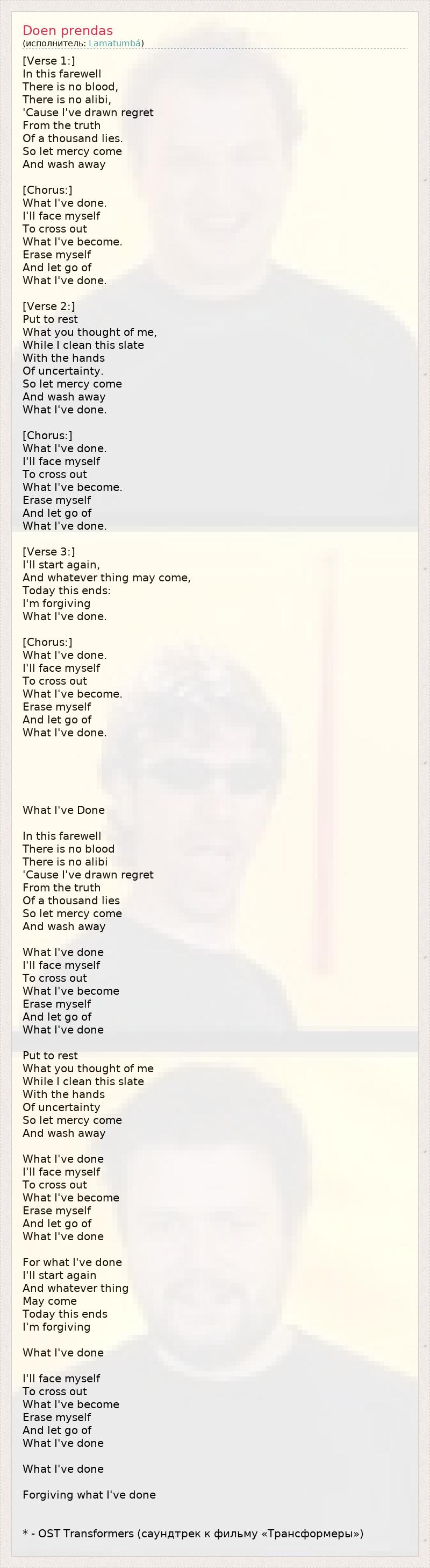 [Verse 1:] In this farewell There is no blood, There is no alibi, 'Cause I've drawn regret From the truth Of a thousand lies. So let mercy come And wash away [Chorus:] What I've done. I'll face myself To cross out What I've become. Erase myself And let go of What I've done. [Verse 2:] Put to rest What you thought of me, While I clean this slate With the hands Of uncertainty. So let mercy come And wash away What I've done. [Chorus:] What I've done. I'll face myself To cross out What I've become. Erase myself And let go of What I've done. [Verse 3:] I'll start again, And whatever thing may come, Today this ends: I'm forgiving What I've done. [Chorus:] What I've done. I'll face myself To cross out What I've become. Erase myself And let go of What I've done. What I've Done In this farewell There is no blood There is no alibi 'Cause I've drawn regret From the truth Of a thousand lies So let mercy come And wash away What I've done I'll face myself To cross out What I've become Erase myself And let go of What I've done Put to rest What you thought of me While I clean this slate With the hands Of uncertainty So let mercy come And wash away What I've done I'll face myself To cross out What I've become Erase myself And let go of What I've done For what I've done I'll start again And whatever thing May come Today this ends I'm forgiving What I've done I'll face myself To cross out What I've become Erase myself And let go of What I've done What I've done Forgiving what I've done * - OST Transformers (саундтрек к фильму «Трансформеры»)