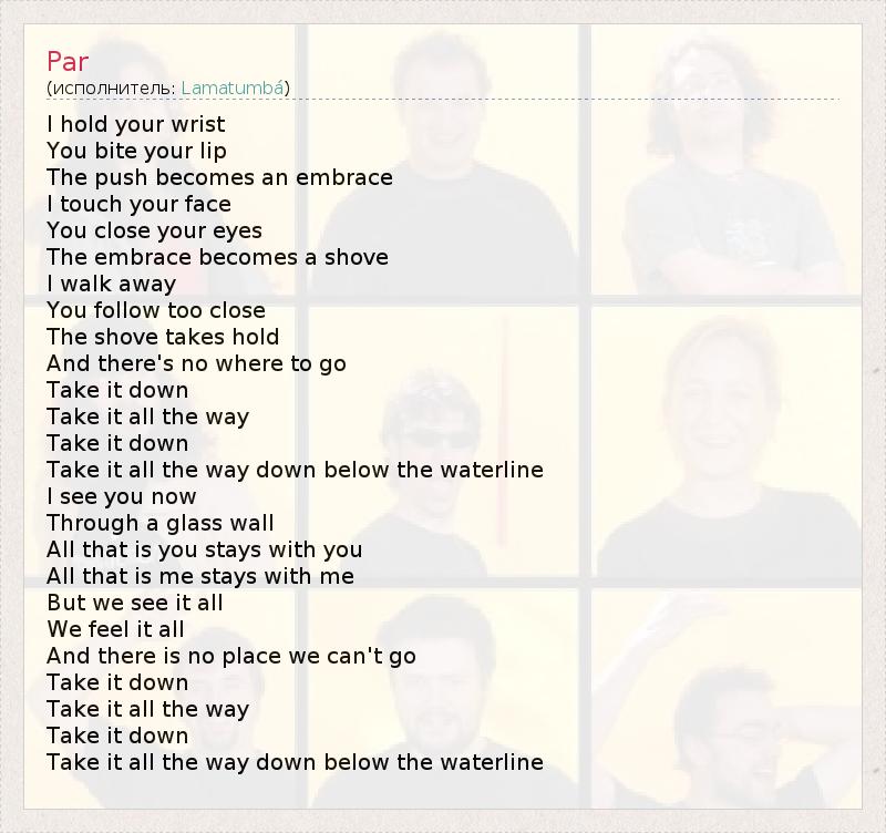 I hold your wrist You bite your lip The push becomes an embrace I touch your face You close your eyes The embrace becomes a shove I walk away You follow too close The shove takes hold And there's no where to go Take it down Take it all the way Take it down Take it all the way down below the waterline I see you now Through a glass wall All that is you stays with you All that is me stays with me But we see it all We feel it all And there is no place we can't go Take it down Take it all the way Take it down Take it all the way down below the waterline