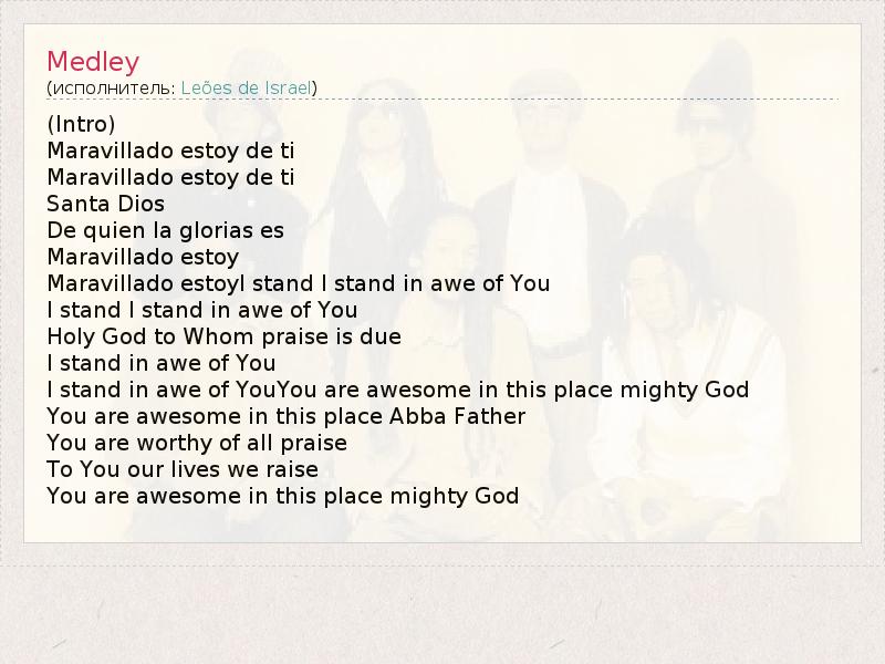 (Intro) Maravillado estoy de ti Maravillado estoy de ti Santa Dios De quien la glorias es Maravillado estoy Maravillado estoyI stand I stand in awe of You I stand I stand in awe of You Holy God to Whom praise is due I stand in awe of You I stand in awe of YouYou are awesome in this place mighty God You are awesome in this place Abba Father You are worthy of all praise To You our lives we raise You are awesome in this place mighty God