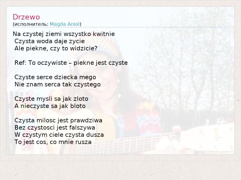 Na czystej ziemi wszystko kwitnie Czysta woda daje zycie Ale piekne, czy to widzicie? Ref: To oczywiste – piekne jest czyste Czyste serce dziecka mego Nie znam serca tak czystego Czyste mysli sa jak zloto A nieczyste sa jak bloto Czysta milosc jest prawdziwa Bez czystosci jest falszywa W czystym ciele czysta dusza To jest cos, co mnie rusza