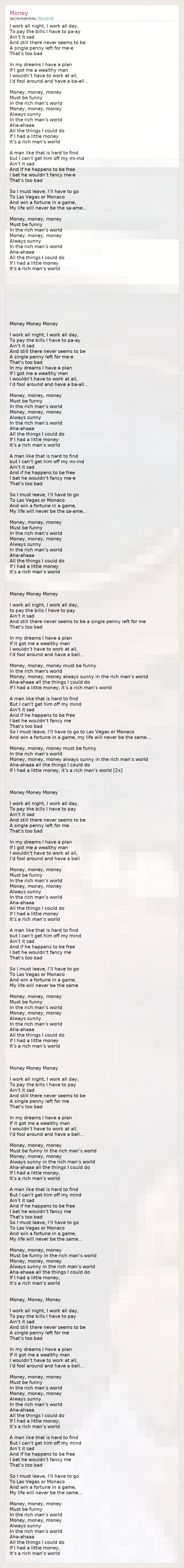 I work all night, I work all day, To pay the bills I have to pa-ay Ain't it sad And still there never seems to be A single penny left for me-e That's too bad In my dreams I have a plan If I got me a wealthy man I wouldn't have to work at all, I'd fool around and have a ba-all... Money, money, money Must be funny In the rich man's world Money, money, money Always sunny In the rich man's world Aha-ahaaa All the things I could do If I had a little money It's a rich man's world A man like that is hard to find but I can't get him off my mi-ind Ain't it sad And if he happens to be free I bet he wouldn't fancy me-e That's too bad So I must leave, I'll have to go To Las Vegas or Monaco And win a fortune in a game, My life will never be the sa-ame... Money, money, money Must be funny In the rich man's world Money, money, money Always sunny In the rich man's world Aha-ahaaa All the things I could do If I had a little money It's a rich man's world Money Money Money I work all night, I work all day, To pay the bills I have to pa-ay Ain't it sad And still there never seems to be A single penny left for me-e That's too bad In my dreams I have a plan If I got me a wealthy man I wouldn't have to work at all, I'd fool around and have a ba-all... Money, money, money Must be funny In the rich man's world Money, money, money Always sunny In the rich man's world Aha-ahaaa All the things I could do If I had a little money It's a rich man's world A man like that is hard to find but I can't get him off my mi-ind Ain't it sad And if he happens to be free I bet he wouldn't fancy me-e That's too bad So I must leave, I'll have to go To Las Vegas or Monaco And win a fortune in a game, My life will never be the sa-ame... Money, money, money Must be funny In the rich man's world Money, money, money Always sunny In the rich man's world Aha-ahaaa All the things I could do If I had a little money It's a rich man's world Money Money Money I work all night, I work all day, to pay the bills I have to pay Ain't it sad And still there never seems to be a single penny left for me That's too bad In my dreams I have a plan If it got me a wealthy man I wouldn't have to work at all, I'd fool around and have a ball... Money, money, money must be funny In the rich man's world Money, money, money always sunny in the rich man's world Aha-ahaaa all the things I could do If I had a little money, it's a rich man's world A man like that is hard to find But I can't get him off my mind Ain't it sad And if he happens to be free I bet he wouldn't fancy me That's too bad So I must leave, I'll have to go to Las Vegas or Monaco And win a fortune in a game, my life will never be the same... Money, money, money must be funny In the rich man's world Money, money, money always sunny in the rich man's world Aha-ahaaa all the things I could do If I had a little money, it's a rich man's world [2x] Money Money Money I work all night, I work all day, To pay the bills I have to pay Ain't it sad And still there never seems to be A single penny left for me That's too bad In my dreams I have a plan If I got me a wealthy man I wouldn't have to work at all, I'd fool around and have a ball Money, money, money Must be funny In the rich man's world Money, money, money Always sunny In the rich man's world Aha-ahaaa All the things I could do If I had a little money It's a rich man's world A man like that is hard to find but I can't get him off my mind Ain't it sad And if he happens to be free I bet he wouldn't fancy me That's too bad So I must leave, I'll have to go To Las Vegas or Monaco And win a fortune in a game, My life will never be the same Money, money, money Must be funny In the rich man's world Money, money, money Always sunny In the rich man's world Aha-ahaaa All the things I could do If I had a little money It's a rich man's world Money Money Money I work all night, I work all day, To pay the bills I have to pay Ain't it sad And still there never seems to be A single penny left for me That's too bad In my dreams I have a plan If it got me a wealthy man I wouldn't have to work at all, I'd fool around and have a ball... Money, money, money Must be funny in the rich man's world Money, money, money Always sunny in the rich man's world Aha-ahaaa all the things I could do If I had a little money, It's a rich man's world A man like that is hard to find But I can't get him off my mind Ain't it sad And if he happens to be free I bet he wouldn't fancy me That's too bad So I must leave, I'll have to go To Las Vegas or Monaco And win a fortune in a game, My life will never be the same... Money, money, money Must be funny in the rich man's world Money, money, money Always sunny in the rich man's world Aha-ahaaa all the things I could do If I had a little money, It's a rich man's world Money, Money, Money I work all night, I work all day, To pay the bills I have to pay Ain't it sad And still there never seems to be A single penny left for me That's too bad In my dreams I have a plan If it got me a wealthy man I wouldn't have to work at all, I'd fool around and have a ball... Money, money, money Must be funny In the rich man's world Money, money, money Always sunny In the rich man's world Aha-ahaaa All the things I could do If I had a little money, It's a rich man's world A man like that is hard to find But I can't get him off my mind Ain't it sad And if he happens to be free I bet he wouldn't fancy me That's too bad So I must leave, I'll have to go To Las Vegas or Monaco And win a fortune in a game, My life will never be the same... Money, money, money Must be funny In the rich man's world Money, money, money Always sunny In the rich man's world Aha-ahaaa All the things I could do If I had a little money, It's a rich man's world