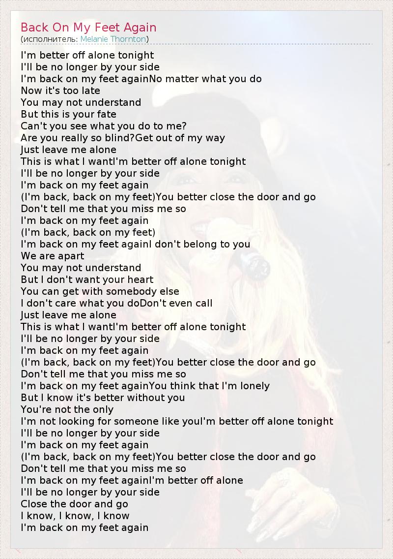 I'm better off alone tonight I'll be no longer by your side I'm back on my feet againNo matter what you do Now it's too late You may not understand But this is your fate Can't you see what you do to me? Are you really so blind?Get out of my way Just leave me alone This is what I wantI'm better off alone tonight I'll be no longer by your side I'm back on my feet again (I'm back, back on my feet)You better close the door and go Don't tell me that you miss me so I'm back on my feet again (I'm back, back on my feet) I'm back on my feet againI don't belong to you We are apart You may not understand But I don't want your heart You can get with somebody else I don't care what you doDon't even call Just leave me alone This is what I wantI'm better off alone tonight I'll be no longer by your side I'm back on my feet again (I'm back, back on my feet)You better close the door and go Don't tell me that you miss me so I'm back on my feet againYou think that I'm lonely But I know it's better without you You're not the only I'm not looking for someone like youI'm better off alone tonight I'll be no longer by your side I'm back on my feet again (I'm back, back on my feet)You better close the door and go Don't tell me that you miss me so I'm back on my feet againI'm better off alone I'll be no longer by your side Close the door and go I know, I know, I know I'm back on my feet again