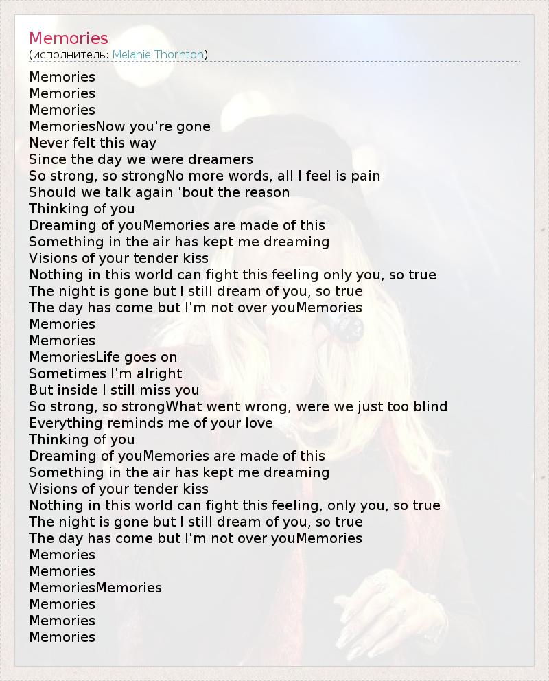 Memories Memories Memories MemoriesNow you're gone Never felt this way Since the day we were dreamers So strong, so strongNo more words, all I feel is pain Should we talk again 'bout the reason Thinking of you Dreaming of youMemories are made of this Something in the air has kept me dreaming Visions of your tender kiss Nothing in this world can fight this feeling only you, so true The night is gone but I still dream of you, so true The day has come but I'm not over youMemories Memories Memories MemoriesLife goes on Sometimes I'm alright But inside I still miss you So strong, so strongWhat went wrong, were we just too blind Everything reminds me of your love Thinking of you Dreaming of youMemories are made of this Something in the air has kept me dreaming Visions of your tender kiss Nothing in this world can fight this feeling, only you, so true The night is gone but I still dream of you, so true The day has come but I'm not over youMemories Memories Memories MemoriesMemories Memories Memories Memories