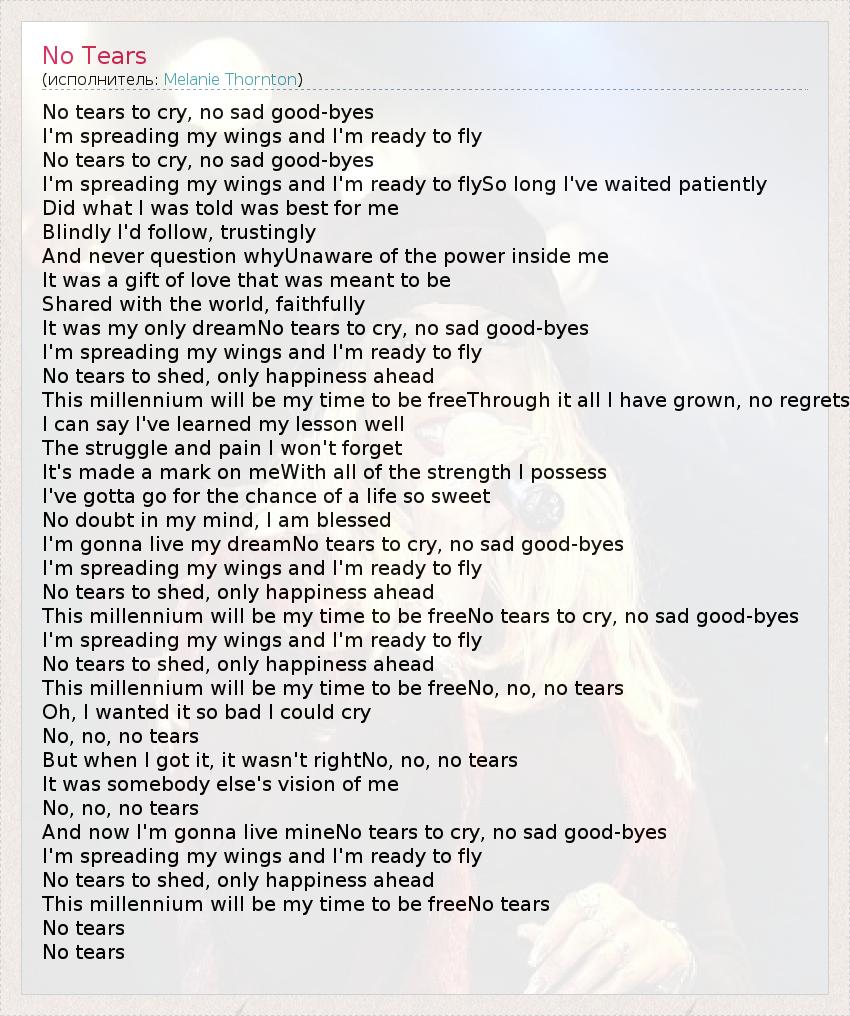 No tears to cry, no sad good-byes I'm spreading my wings and I'm ready to fly No tears to cry, no sad good-byes I'm spreading my wings and I'm ready to flySo long I've waited patiently Did what I was told was best for me Blindly I'd follow, trustingly And never question whyUnaware of the power inside me It was a gift of love that was meant to be Shared with the world, faithfully It was my only dreamNo tears to cry, no sad good-byes I'm spreading my wings and I'm ready to fly No tears to shed, only happiness ahead This millennium will be my time to be freeThrough it all I have grown, no regrets I can say I've learned my lesson well The struggle and pain I won't forget It's made a mark on meWith all of the strength I possess I've gotta go for the chance of a life so sweet No doubt in my mind, I am blessed I'm gonna live my dreamNo tears to cry, no sad good-byes I'm spreading my wings and I'm ready to fly No tears to shed, only happiness ahead This millennium will be my time to be freeNo tears to cry, no sad good-byes I'm spreading my wings and I'm ready to fly No tears to shed, only happiness ahead This millennium will be my time to be freeNo, no, no tears Oh, I wanted it so bad I could cry No, no, no tears But when I got it, it wasn't rightNo, no, no tears It was somebody else's vision of me No, no, no tears And now I'm gonna live mineNo tears to cry, no sad good-byes I'm spreading my wings and I'm ready to fly No tears to shed, only happiness ahead This millennium will be my time to be freeNo tears No tears No tears