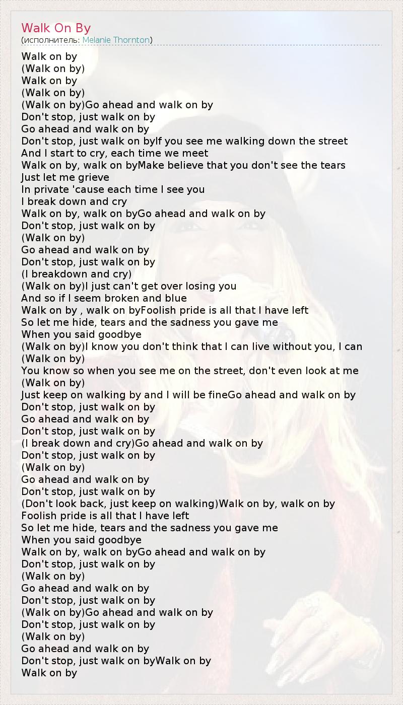 Walk on by (Walk on by) Walk on by (Walk on by) (Walk on by)Go ahead and walk on by Don't stop, just walk on by Go ahead and walk on by Don't stop, just walk on byIf you see me walking down the street And I start to cry, each time we meet Walk on by, walk on byMake believe that you don't see the tears Just let me grieve In private 'cause each time I see you I break down and cry Walk on by, walk on byGo ahead and walk on by Don't stop, just walk on by (Walk on by) Go ahead and walk on by Don't stop, just walk on by (I breakdown and cry) (Walk on by)I just can't get over losing you And so if I seem broken and blue Walk on by , walk on byFoolish pride is all that I have left So let me hide, tears and the sadness you gave me When you said goodbye (Walk on by)I know you don't think that I can live without you, I can (Walk on by) You know so when you see me on the street, don't even look at me (Walk on by) Just keep on walking by and I will be fineGo ahead and walk on by Don't stop, just walk on by Go ahead and walk on by Don't stop, just walk on by (I break down and cry)Go ahead and walk on by Don't stop, just walk on by (Walk on by) Go ahead and walk on by Don't stop, just walk on by (Don't look back, just keep on walking)Walk on by, walk on by Foolish pride is all that I have left So let me hide, tears and the sadness you gave me When you said goodbye Walk on by, walk on byGo ahead and walk on by Don't stop, just walk on by (Walk on by) Go ahead and walk on by Don't stop, just walk on by (Walk on by)Go ahead and walk on by Don't stop, just walk on by (Walk on by) Go ahead and walk on by Don't stop, just walk on byWalk on by Walk on by