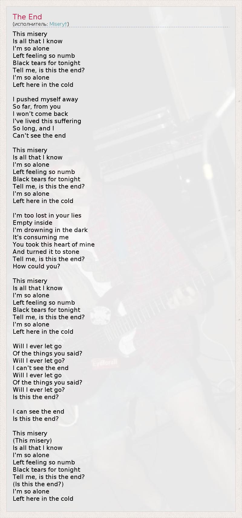 This misery Is all that I know I'm so alone Left feeling so numb Black tears for tonight Tell me, is this the end? I'm so alone Left here in the cold I pushed myself away So far, from you I won't come back I've lived this suffering So long, and I Can't see the end This misery Is all that I know I'm so alone Left feeling so numb Black tears for tonight Tell me, is this the end? I'm so alone Left here in the cold I'm too lost in your lies Empty inside I'm drowning in the dark It's consuming me You took this heart of mine And turned it to stone Tell me, is this the end? How could you? This misery Is all that I know I'm so alone Left feeling so numb Black tears for tonight Tell me, is this the end? I'm so alone Left here in the cold Will I ever let go Of the things you said? Will I ever let go? I can't see the end Will I ever let go Of the things you said? Will I ever let go? Is this the end? I can see the end Is this the end? This misery (This misery) Is all that I know I'm so alone Left feeling so numb Black tears for tonight Tell me, is this the end? (Is this the end?) I'm so alone Left here in the cold